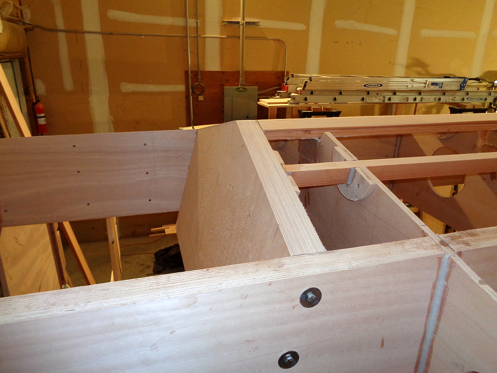 Fitting and measuring the mount by holding it above my head while standing on my tip-toes wasn’t going to happen, so I wrapped a couple cleats in packing tape to make “ramps” at the correct angle, so I could slide the mount up into the boat and clamp it into place while making adjustments. Then, considering I had about $100 worth of plywood and epoxy invested in the blank for the mount, I made a plywood template by tracing around the well sides, stringers and keel. It fit right the first time, so I traced it onto the blank, and cut out the mount — very slow going through a two-inch lamination.