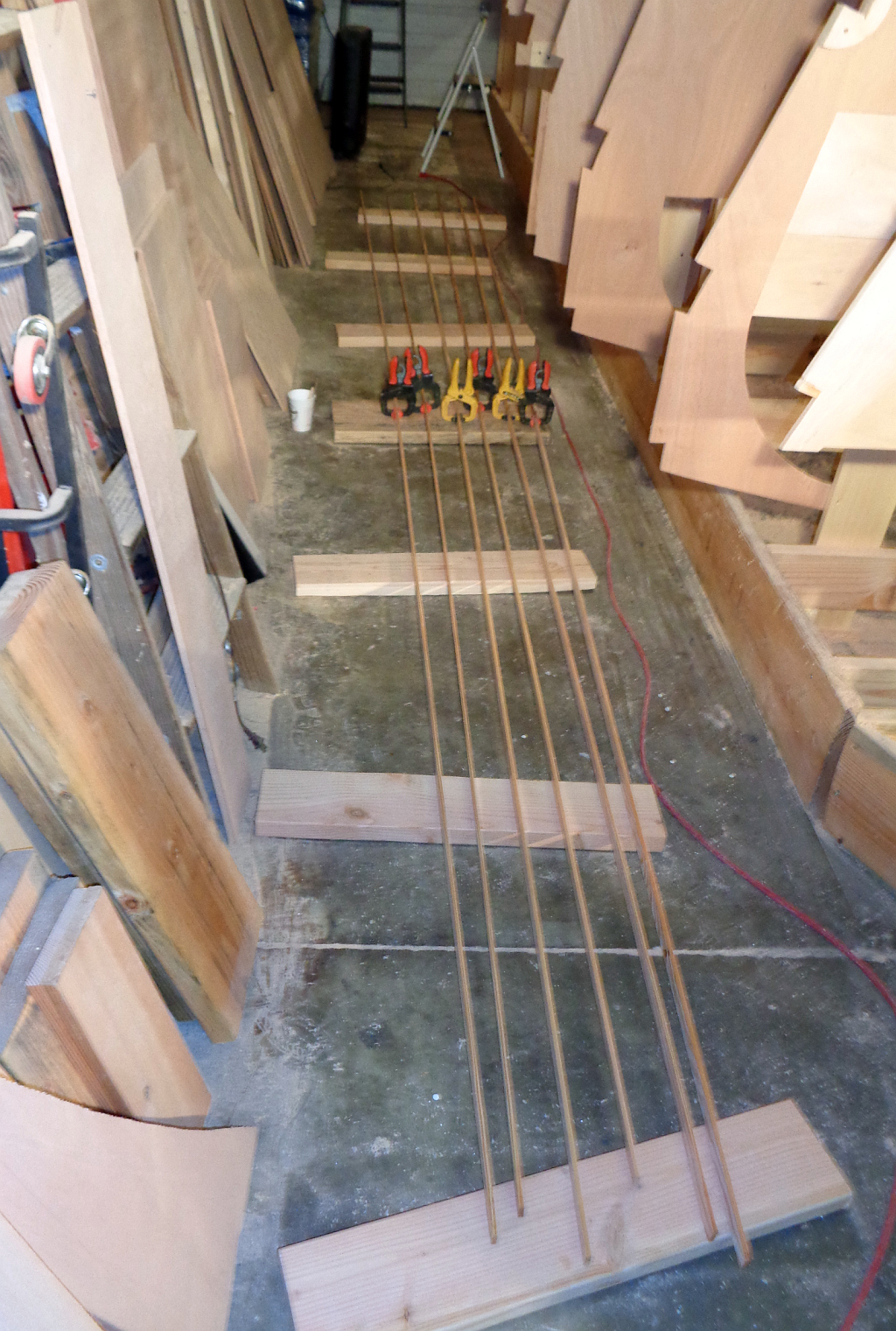 The string and 2 X 4 supporting the forward clamps in the pictures give the forward laminations an extra bit of twist to get them lying just right.  Crude, but it works, and whatever works when 17 feet of laminations are turning to rock is good with me.