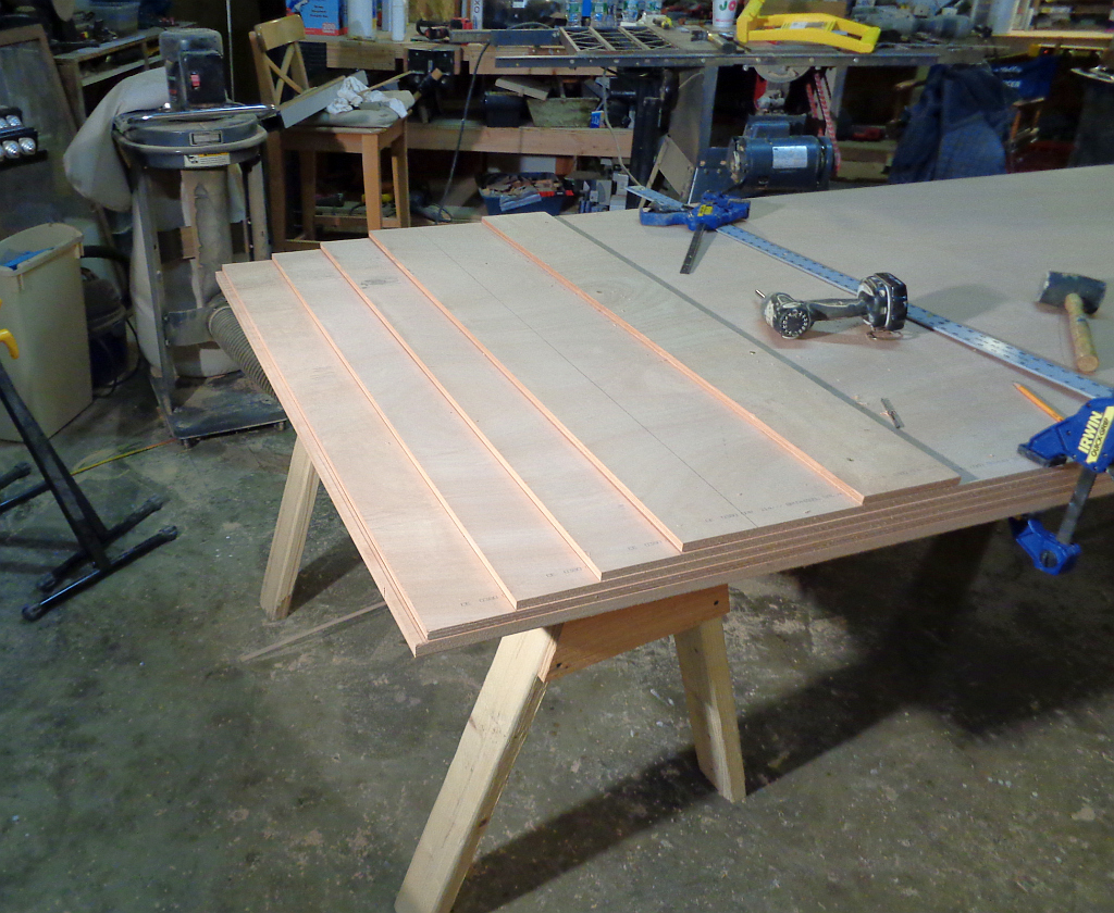 Scarfed up the first batch of plywood. Every instruction book tells you how to set up the stack, clamp it down, etc., so I won’t go into that. Working with a power planer, Ray’s huge 4X24 belt sander, my little belt sander and a random orbit sander is just grunt labor, but it has to be done. Frankly, working with 1/2-inch ply is easier than with little-boat thin stuff since it is so heavy that it can’t move, and the edge veneers are thicker and don’t tear.