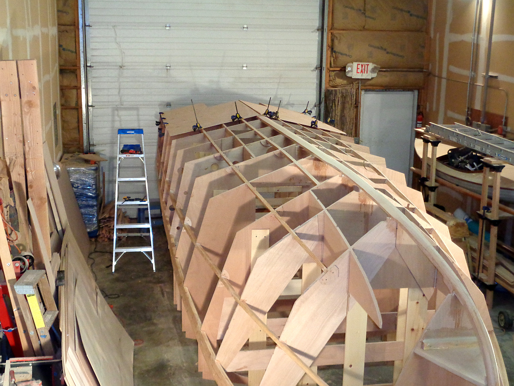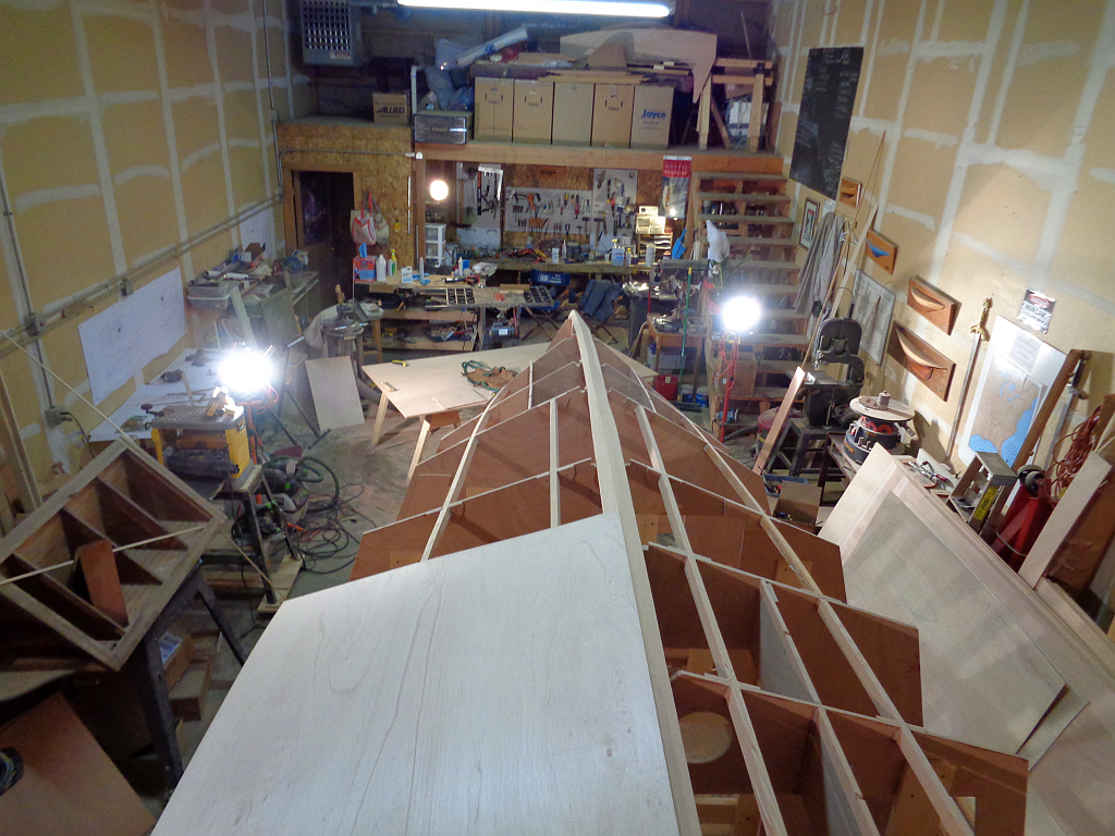 The planks went on with no drama at all: plenty of glue squeeze out, flat to the frame, no gaps at the edges. But I really did need Ray: a five-foot-over-the-head dead lift of a full sheet of plywood is just not something I can do any more. The gap between the planks at the keel is a little wide, since I forgot to compensate for a small round-over I put on the chine edge of the planks to make it fit better, and had to pull the edges out about 1/4-inch at the last minute. The gap will be filled and covered by the keel.
