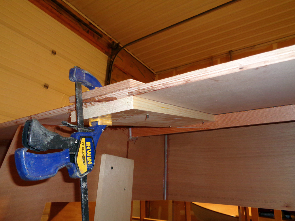 I am not fond of scarfing planks on the boat. There is a lot more precision and control on the bench. But they look okay so far. I’m simply clamping them between a ply strip and pieces of pine (which draws up nicely using drywall screws), all of them wrapped in packing tape.