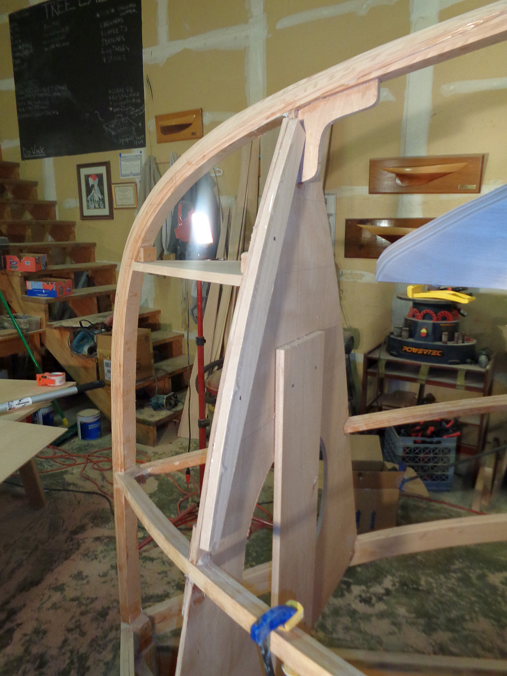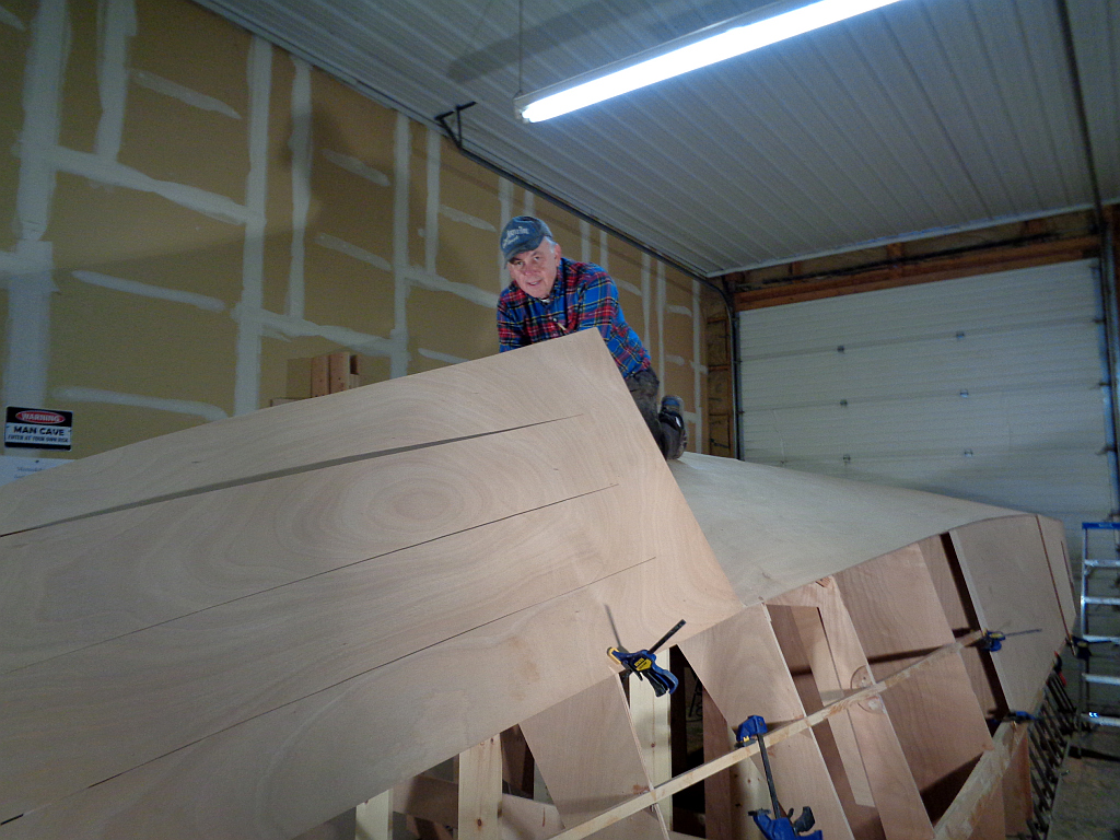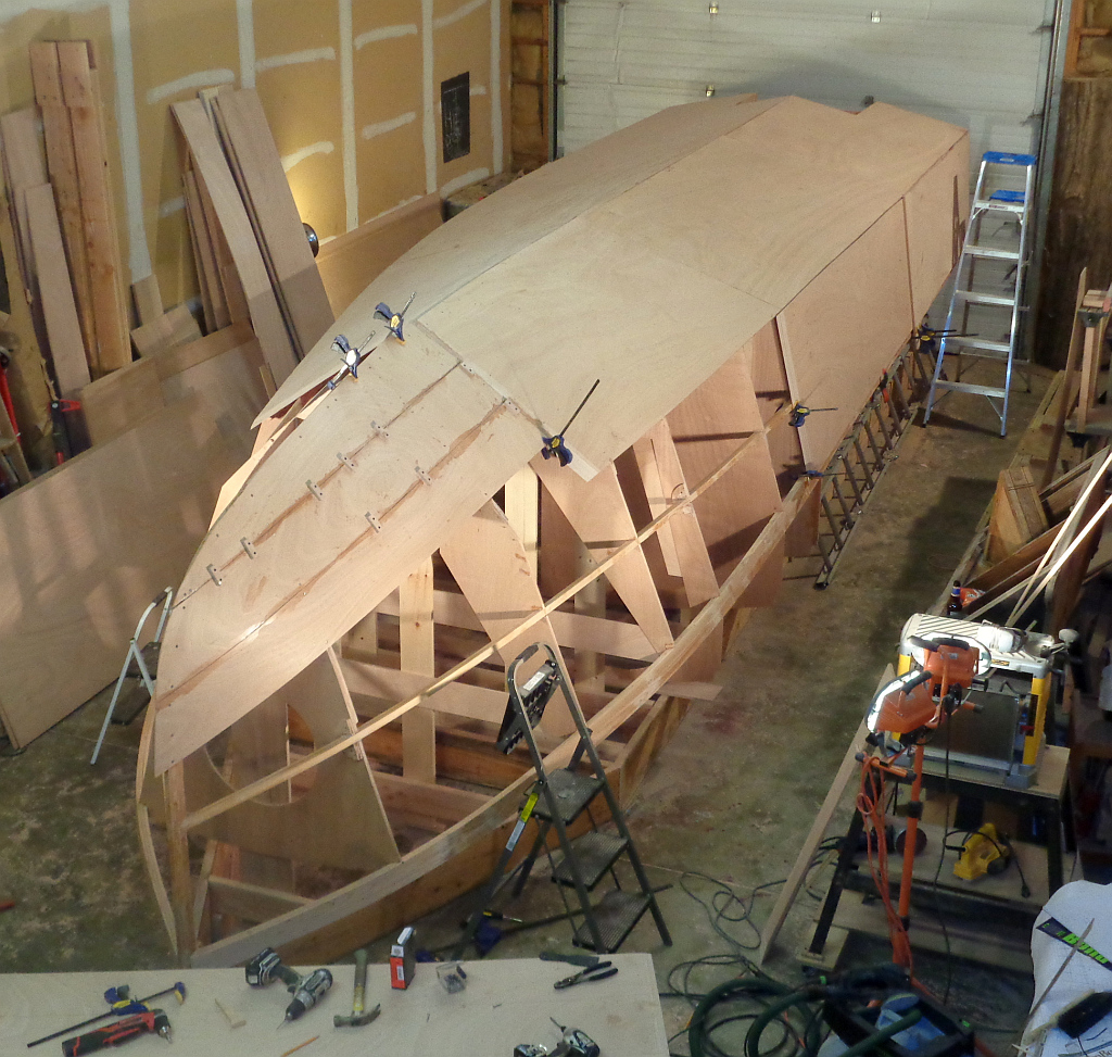 Put on two more side planks yesterday with Ray’s help and started the bow planking.  The bow has a lot of twist and curve to the planking and has to be done in two 1/4-inch layers.  Aside from getting the plywood to bend, this is a challenging spot to plank because there is not a lot of framing/stringers in this area, thus not much to screw into to help hold everything down.
