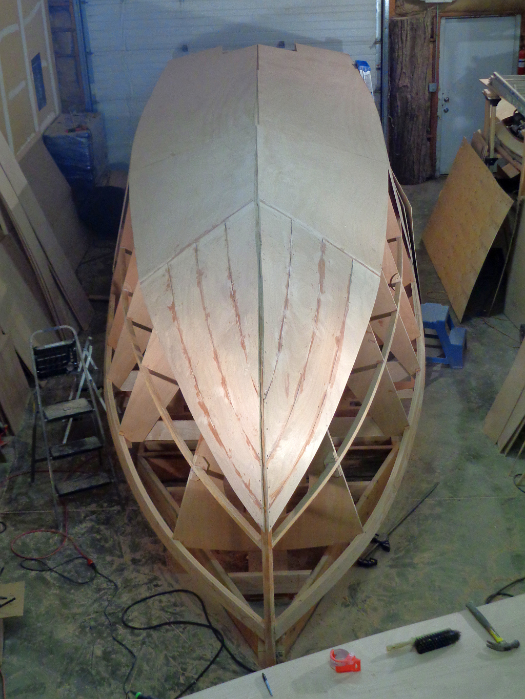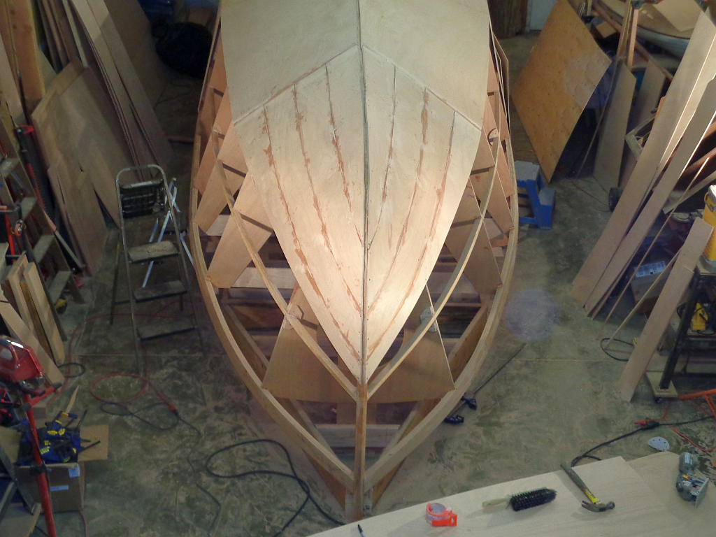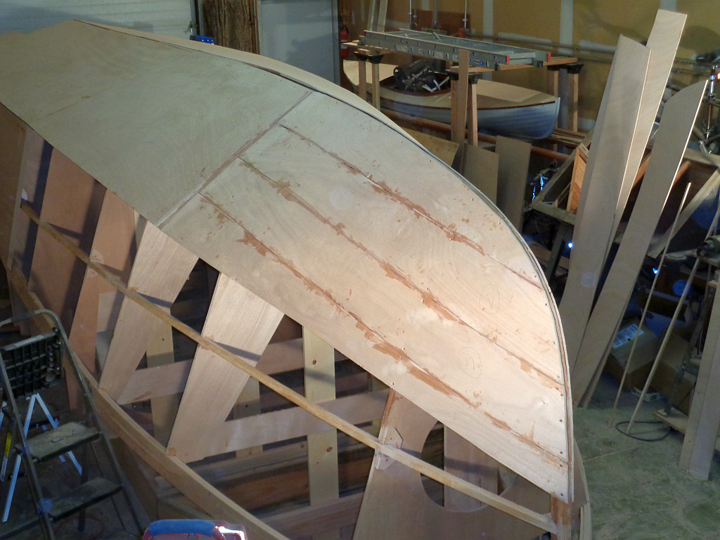 Port fore-and-aft planks went on without much drama, except…Ray and I took pains to make patterns from the planks that fit pretty well on the starboard side. But when we put them on the planking stock, we forgot to turn them over. So the scarfs were all upside down. Had to start over, but at least the rejects can be used for the diagonal planking all the way around.