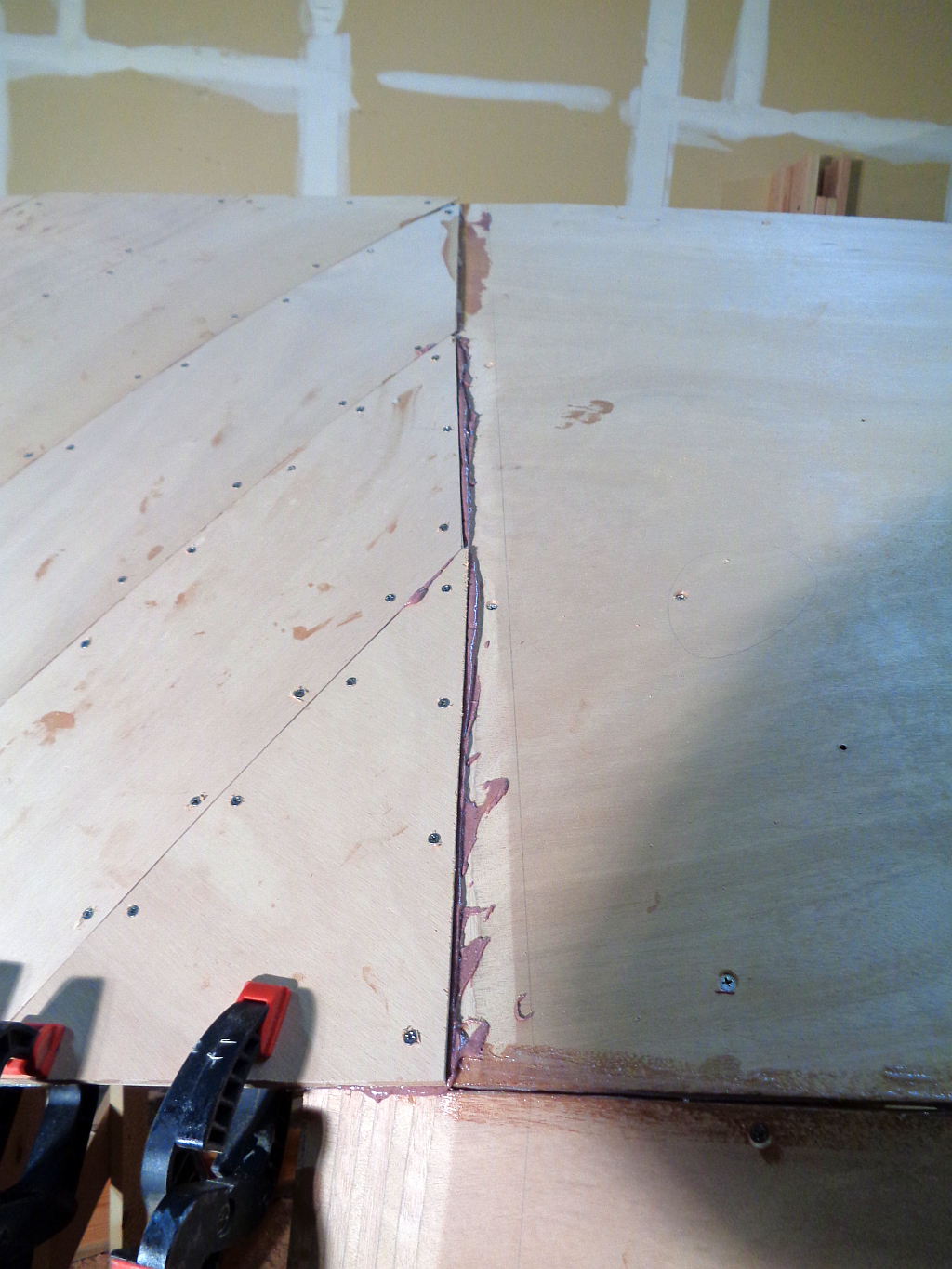 Ray and I won the Battle of Okoume Bend after a pretty tough fight deploying  big clamps and big screws, finally getting 1/2-inch plywood around Tardis’ shapely bow.