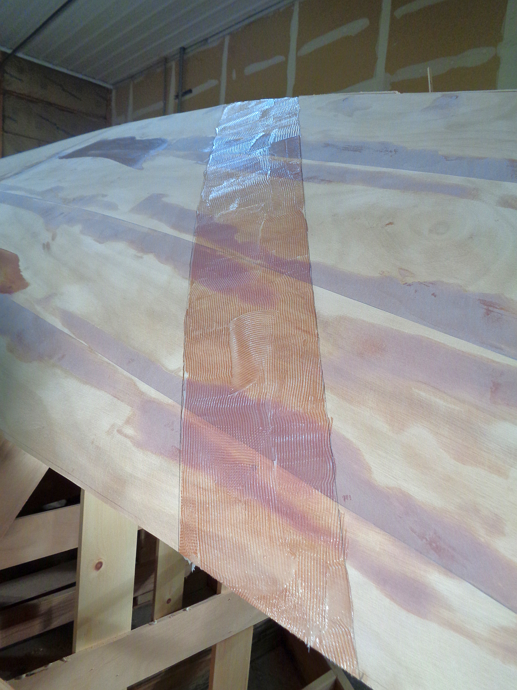 The one problem with the diagonals was the scarf between 1/4 and 1/2 inch ply.  The first layer went in smoothly, but the second, being at a bendy place, would not lay down flat.  So I put the planks into a thick bed of epoxy full depth without a scarf and will fair them in with sort of a reverse scarf from the top.  Any way you look at it there will be a full 1/2 inch of material, the chine and two layers of tape at this junction, so nothing is going to fall apart.