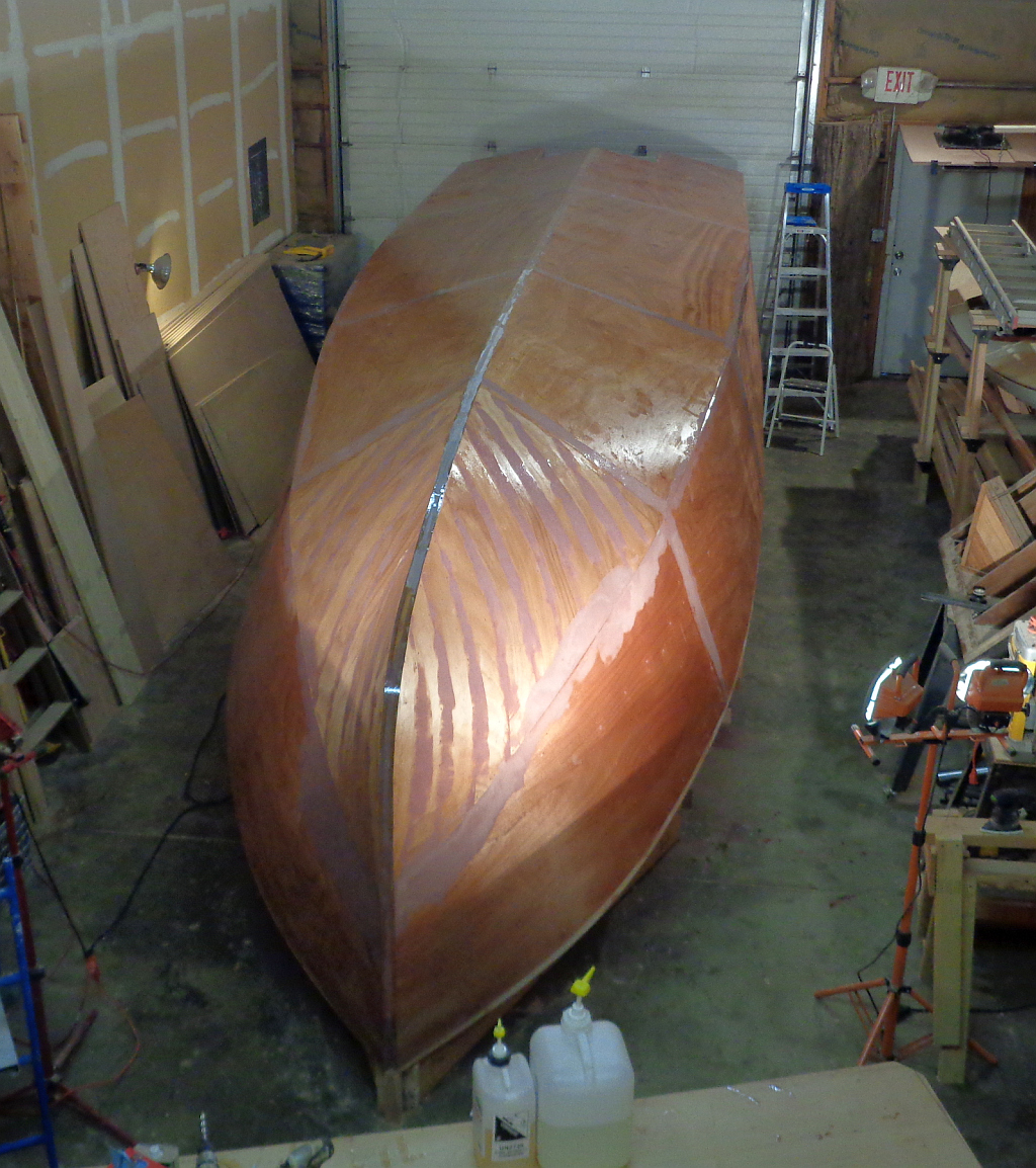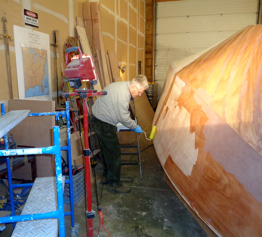 After even more sanding (interrupted by the inevitable New England snow storm), Ray came over and we rolled on the “cheater coat,” a coating of epoxy laid down before any fiberglass goes on the boat. Experienced builders don’t use it (hence the name), but I think it gives a nice solid substrate for the upcoming work even though it burns epoxy, time, and inevitably, requires more sanding. The builders who ALWAYS use a cheater coat are kayak builders and surfboard carvers looking for an absolutely perfect finish, so I cheat, too.