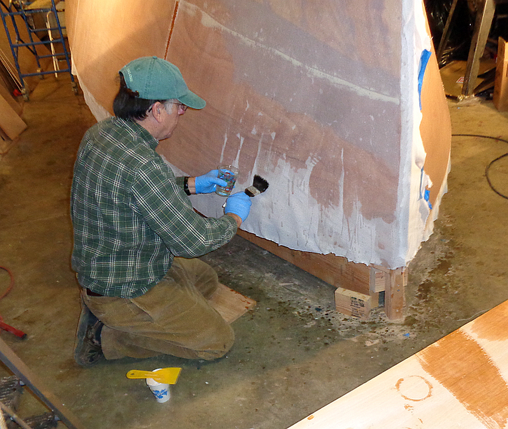 Ray really helped on the glassing — having someone to mix epoxy and help with the sides while I hung by my toe-nails on the boat squeegeeing epoxy saved a lot of time.