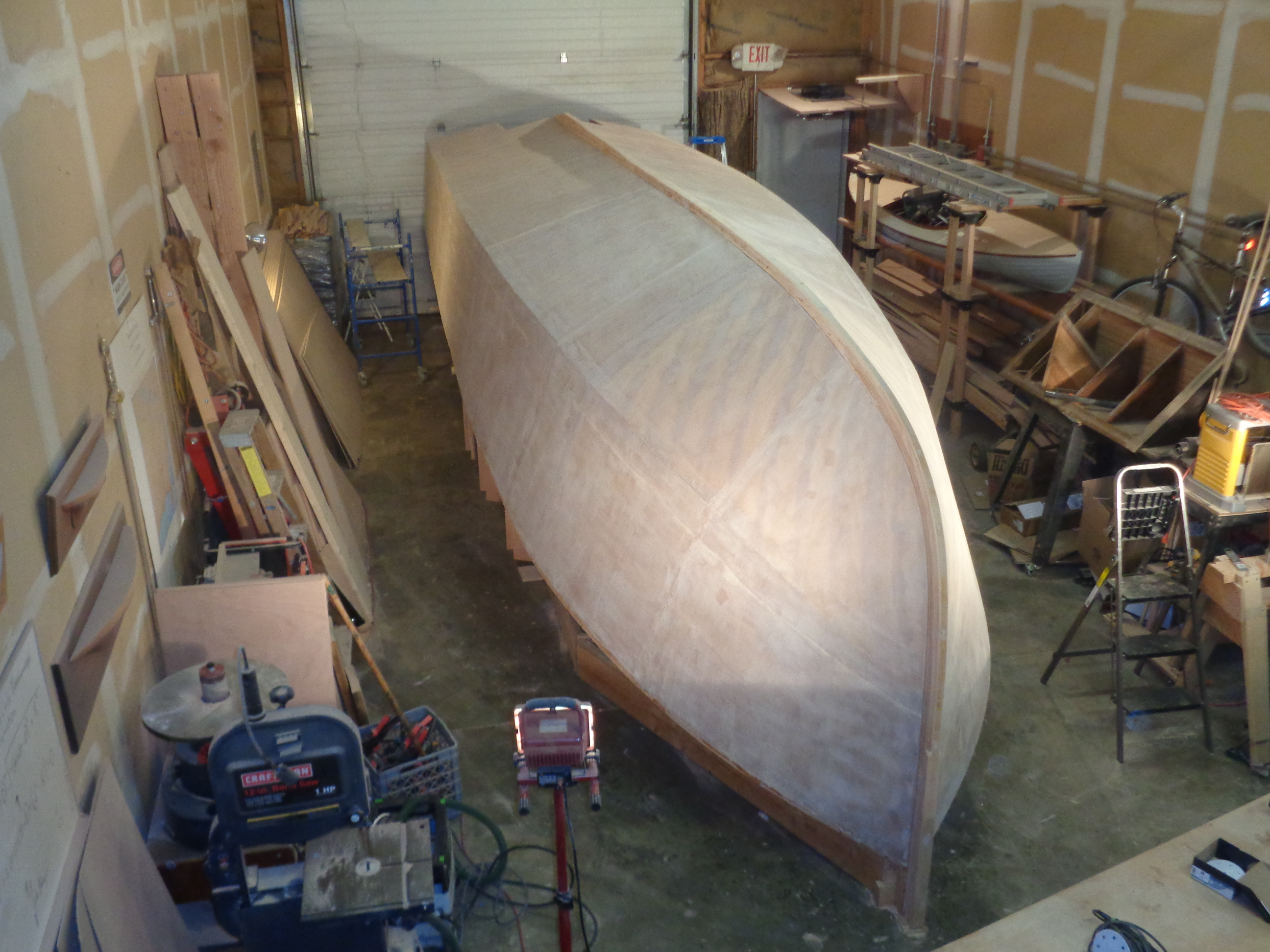 Stem and keel went on pretty easily, with Ray coming for a day to hand me tools and glue while on top. I had fought the joint between the inner stem and the outer stem to a draw. I thought it was good enough after probably six hours or so of work. So I was delighted that the two-by-two inch fir lamination actually had some spring to it and squished down into the epoxy for a very tight fit.