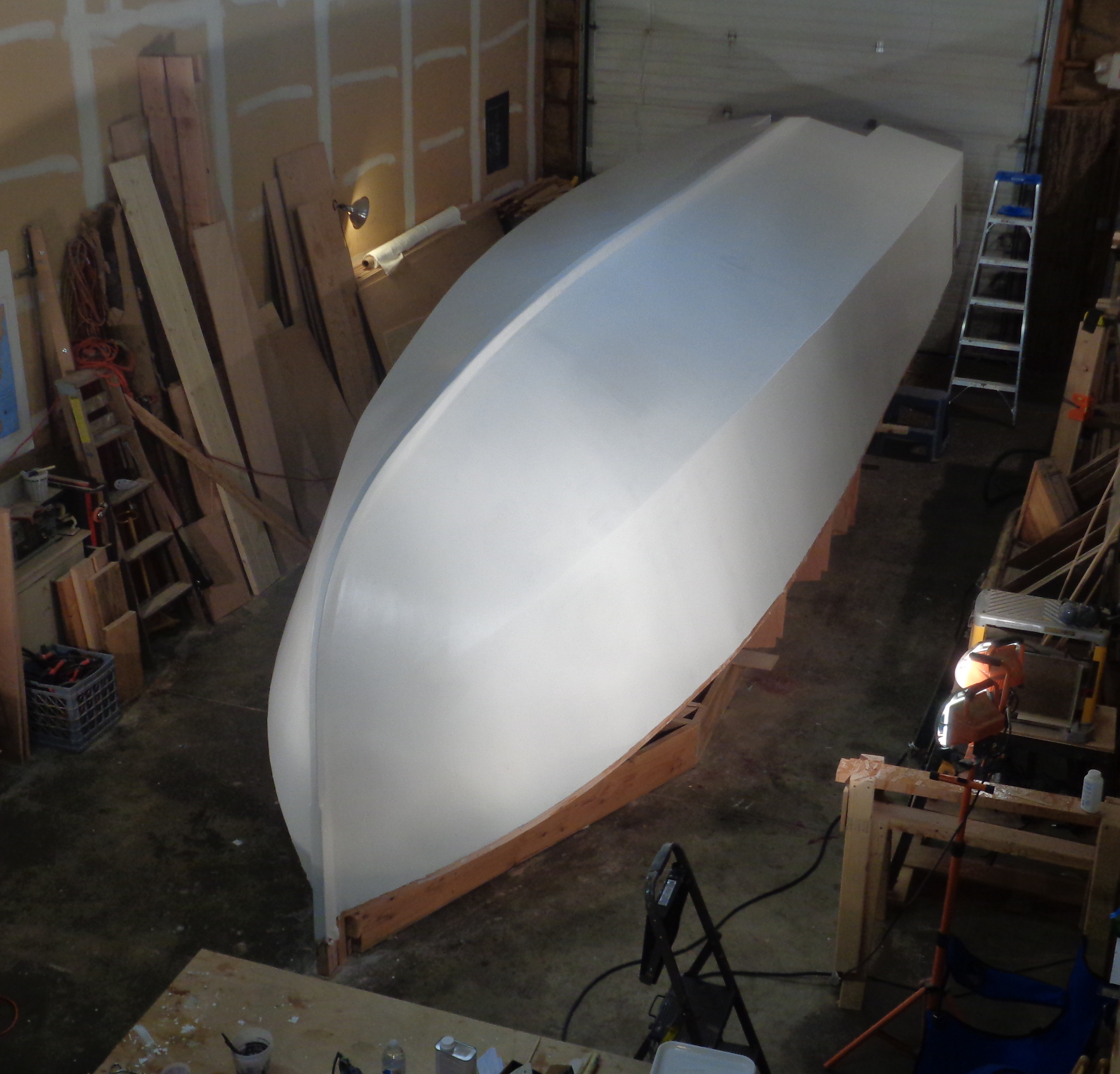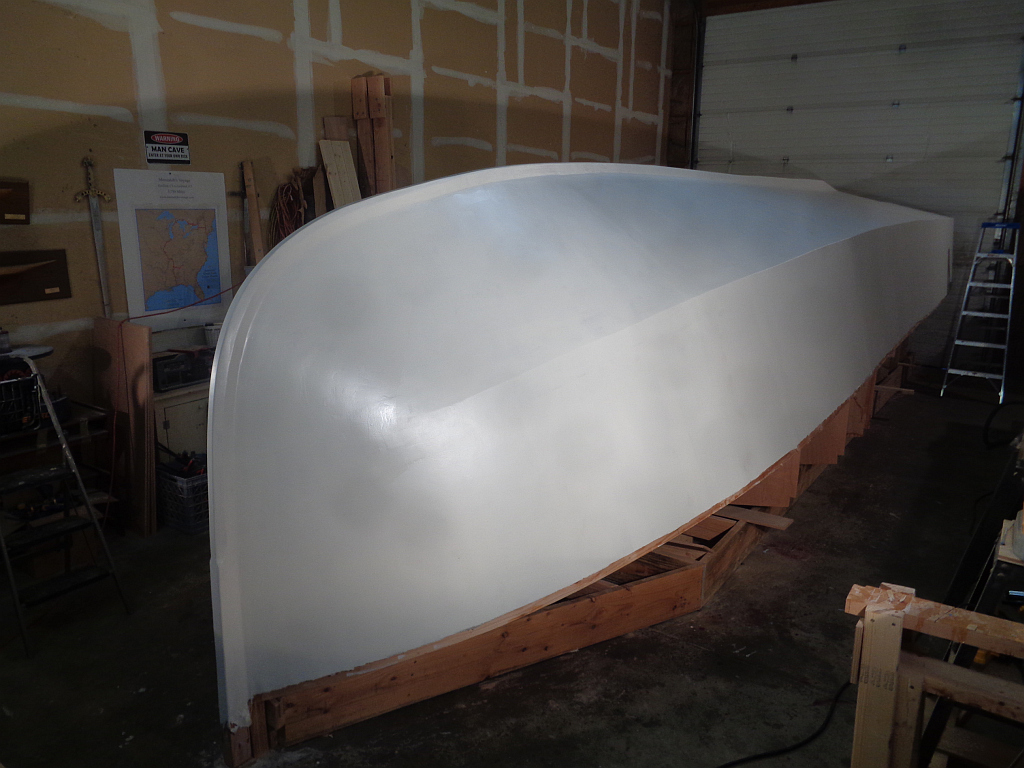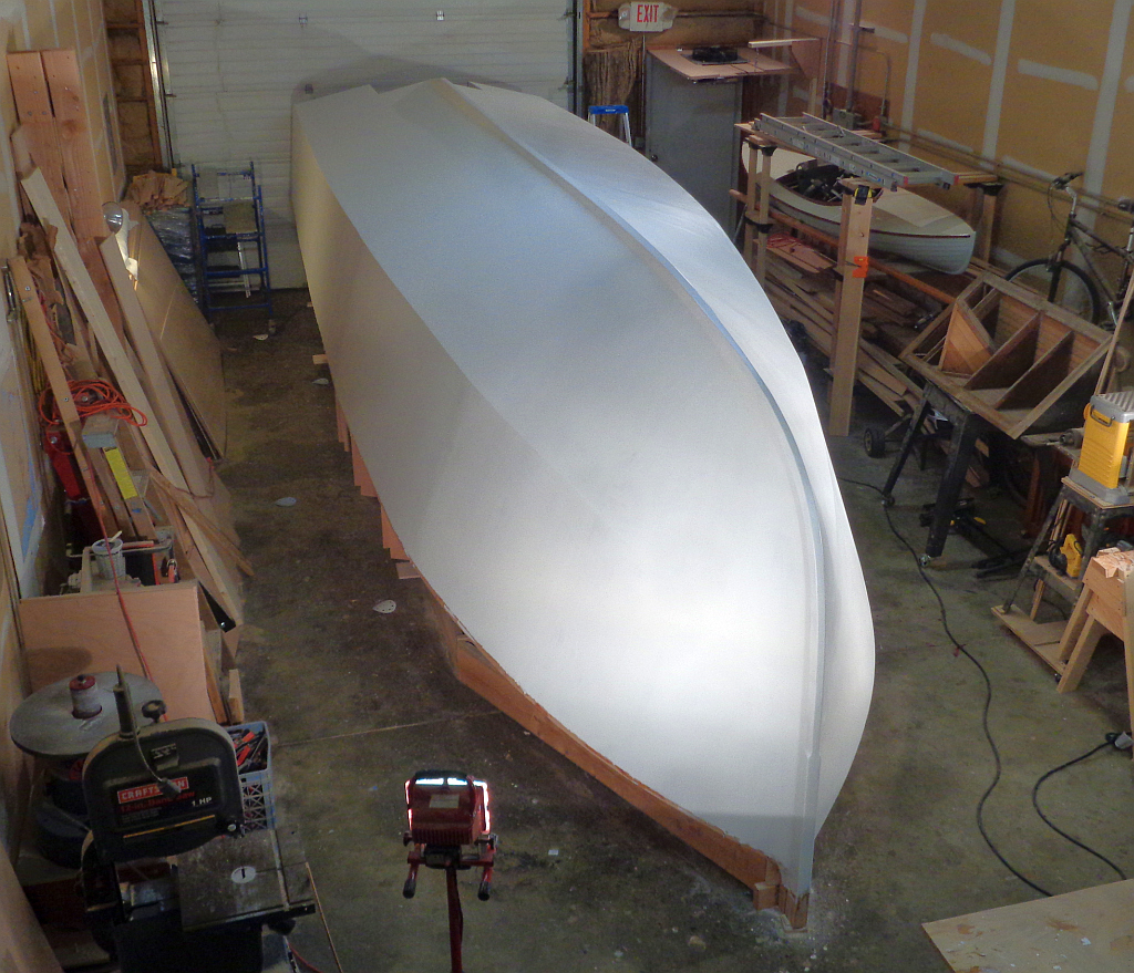 The primer looks so good with three coats on, I can’t resist posting some pictures. It was a lot of work this week sanding the whole boat and solvent washing between coats, then painting, but quite rewarding as the finish got whiter and smoother every day.