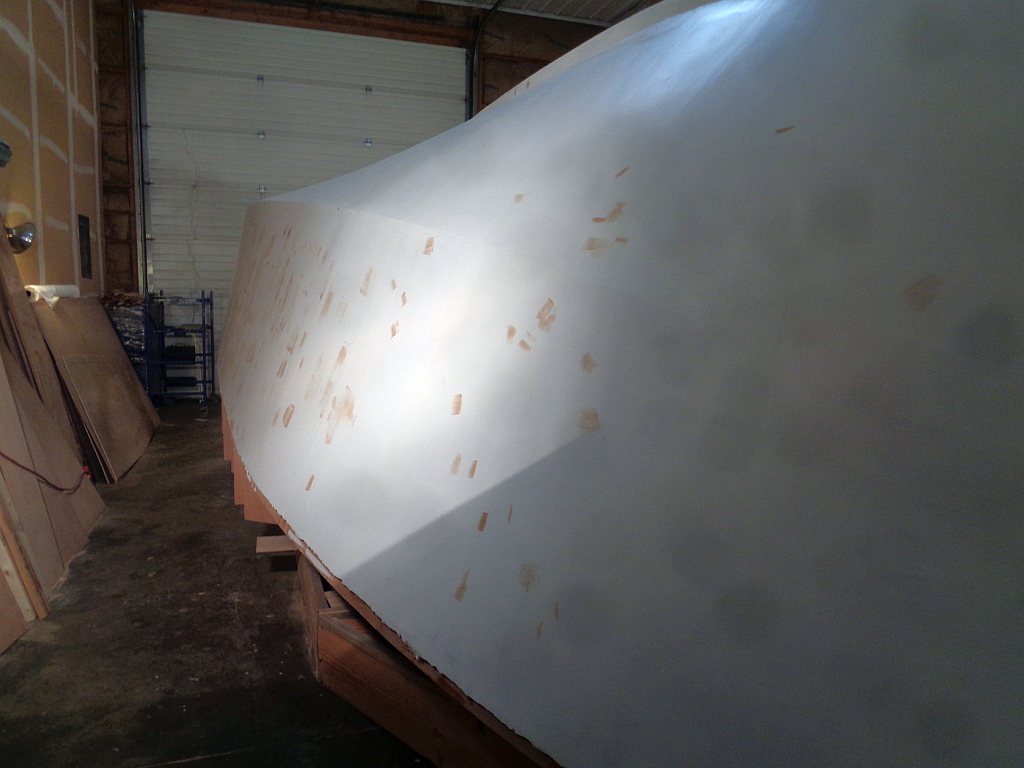 I stared down disaster twice with the primer on the Tardis (now that she’s painted, I find myself calling her by her name rather than “the boat.”) After I took the initial primer pictures, I found about a foot-square area starboard amidships with a dozen bubbles ranging from 1/16 to 1/8 inch. Bubbles COULD mean air coming from under the glass and poor adhesion, so I was pretty worried. So I drilled down through the glass and just into the plywood. No problems — sharp shards of epoxy and glass, no uncured resin, dry sawdust. So I drilled the bubbles out and filled them with a strong epoxy mixture, and the next morning they were fine. I think what happened was that I put some extra fairing compound on this area only the day before paint. It probably wasn’t fully cured and off-gassed a little. The whole area is rock-hard now.