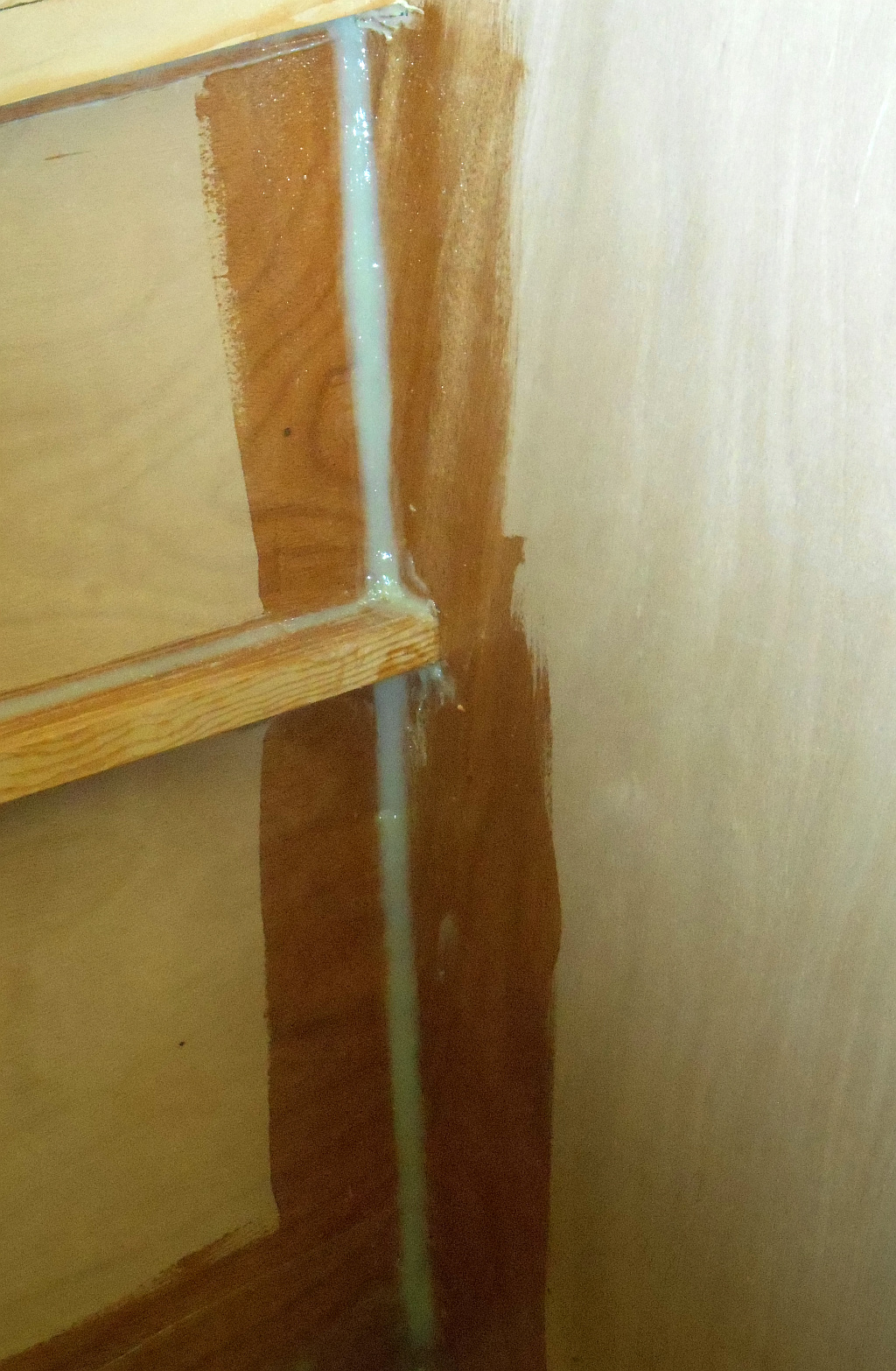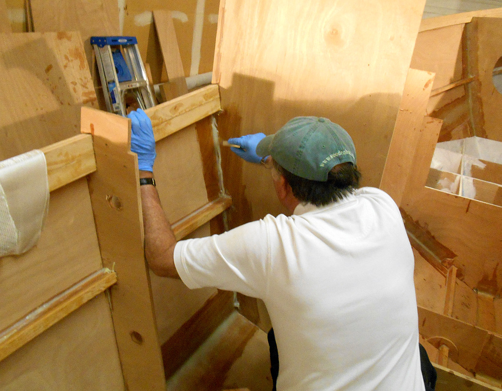 So I decided to wet out the glass the way you do with a horizontal surface, simply pouring it on and letting is soak through. Hence my trip to the housewares department for a surface to work on. I think this method works, so I had John take pictures of the whole process. There are two bonuses to the “pour on” method aside from easy wetout: 1) The wet biax is so pliable that you don’t need to form a perfect fillet before applying (if you do, the tape messes it up anyway). You can make a pretty decent cove just smoothing the thickened epoxy into the joint with a small, stiff brush, then forming a cove by pushing through the tape with the brush and your fingers. 2) The epoxy in the biax soaks through the top layer of woven tape pretty quickly. Just let it sit about a minute and brush out any dry spots.