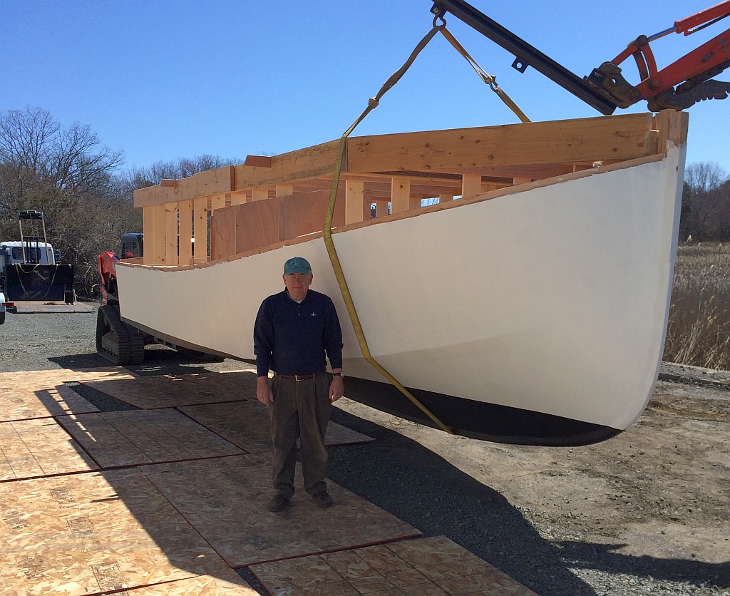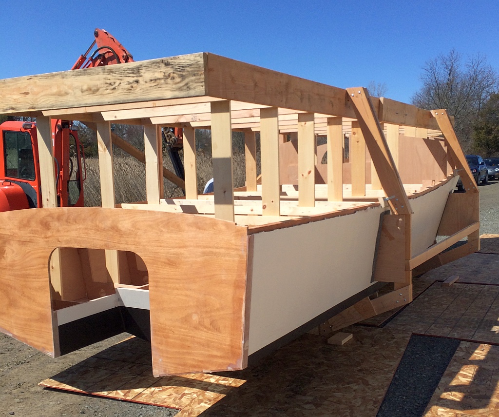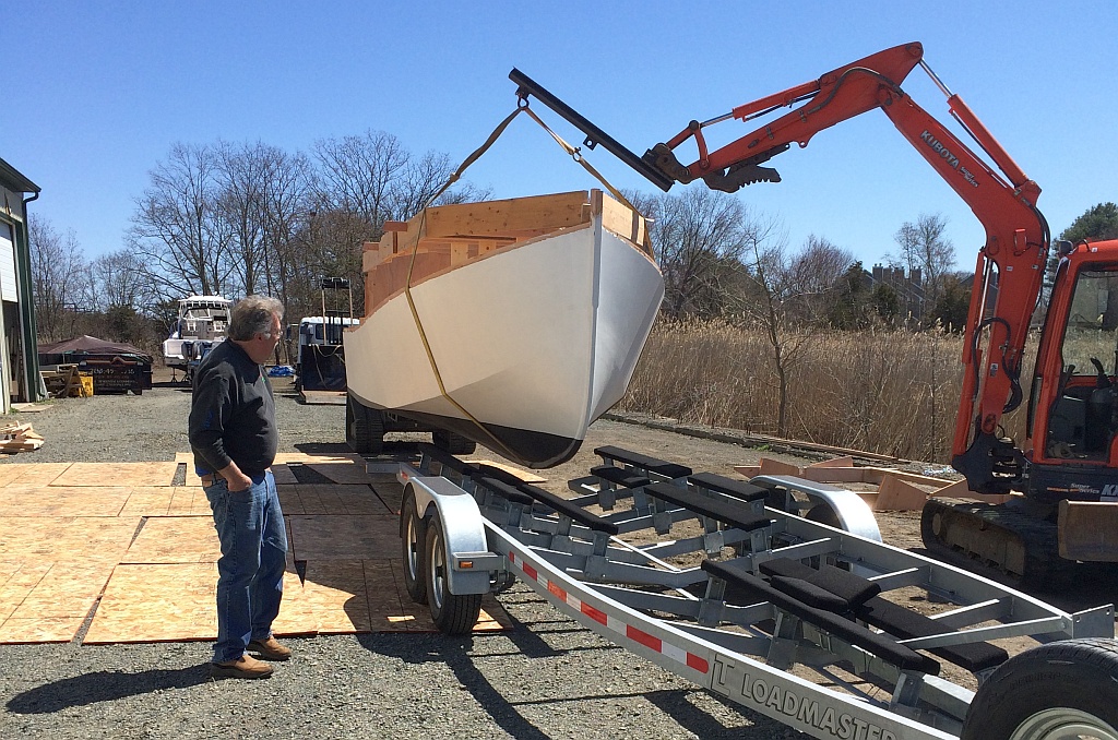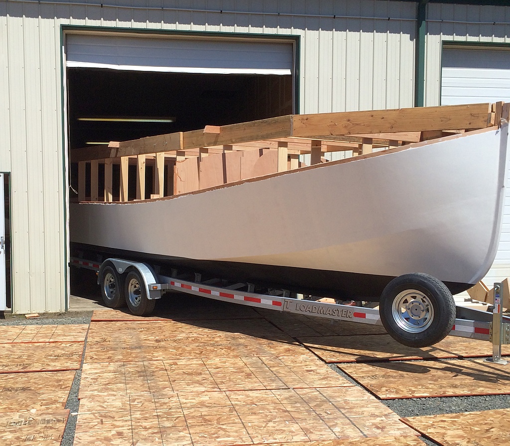 Since bonding makes for very unexciting photography (epoxy, tape, more tape, more epoxy), I want to share some great pictures I just received from my friend Bob Scott. When Bob wasn’t pushing and tugging on the boat, he was taking stills, while Molly handled the video. I think those of the boat going onto the trailer give a much better picture of what the Tardis really looks like than the ones in the shop.