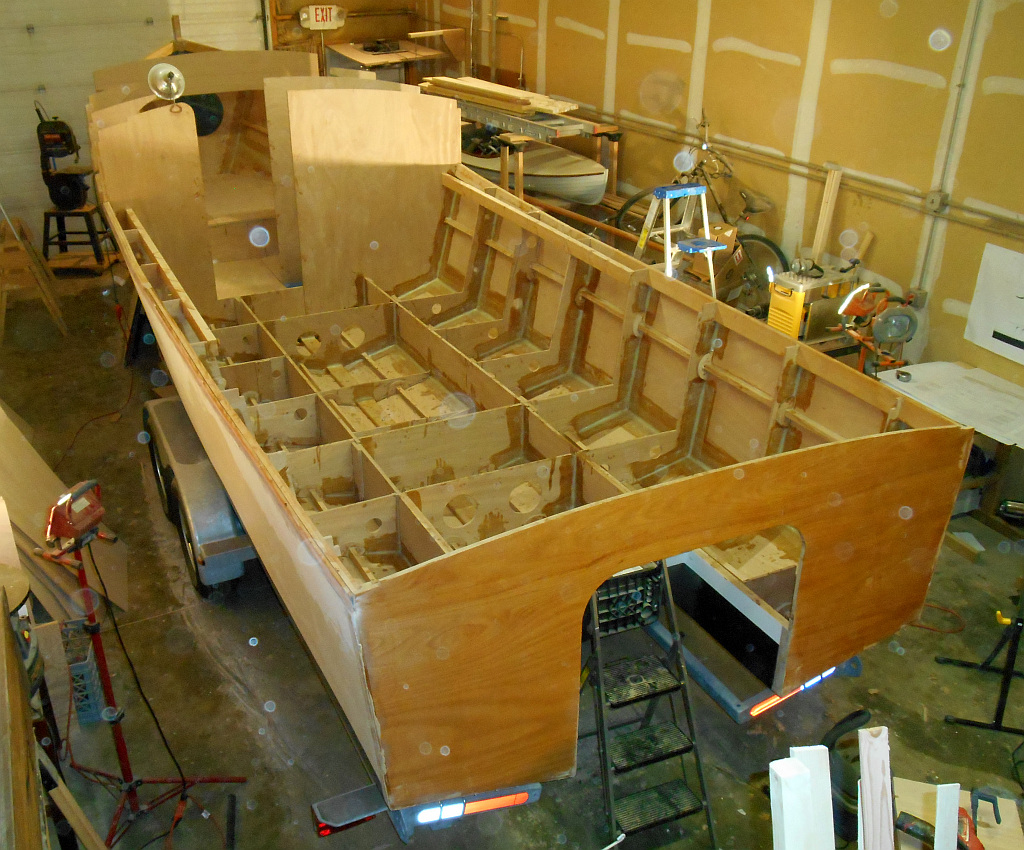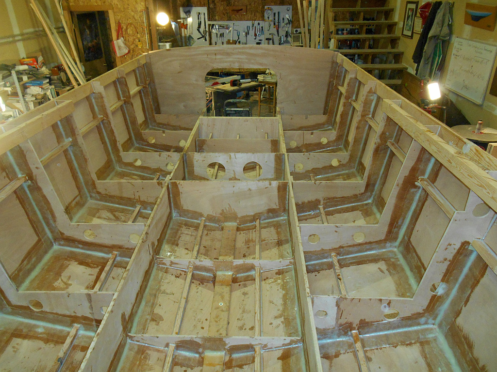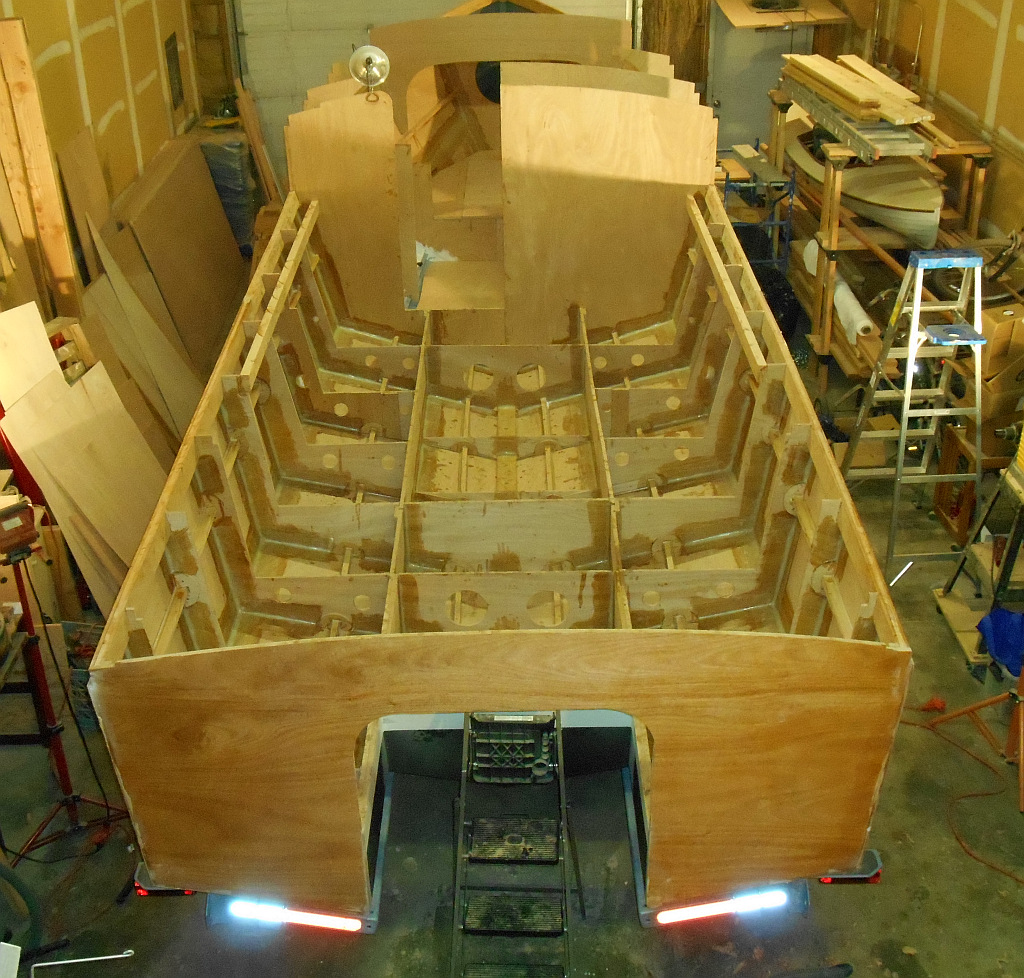 Free at last! Every piece of the hull has been bonded, epoxied, glued, coved, tabbed and affixed to every other piece.