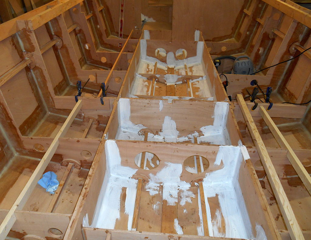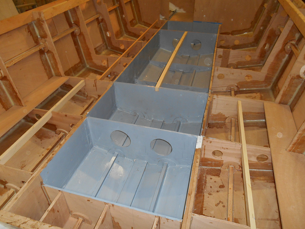 I have been at this for a year now, and it has been a wonderful year by any measure. I wanted to have some, big significant piece of work to mark the boat’s first birthday, but all I could come up with was painting the bilge/tankage spaces. I also made a very good start today on the system which will hold up the cockpit and cabin soles.