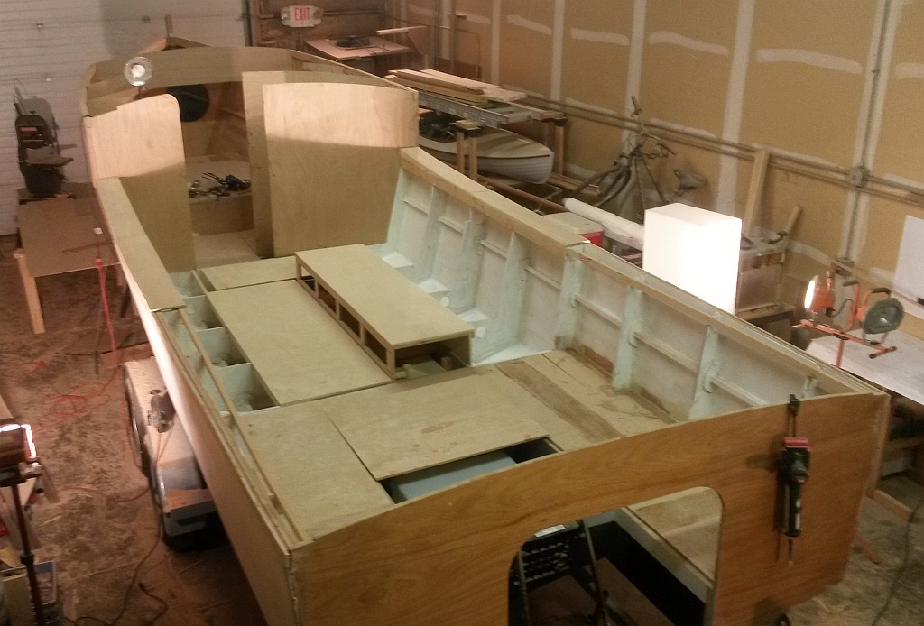 To move ahead on the deckhouse structure, I had to build up the raised section of the dinette that also functions as very useful storage. But I was blasting away on the framing when I realized that if I totally built out the dinette, I would have to laminate the side decks from outside the boat on a ladder, much harder than standing nice and steady inside. So I framed them up and laminated them on, which was a chore involving hours of grinding since they needed just a little downslope to shed water. But in the end made the hull looks a lot more finished.
