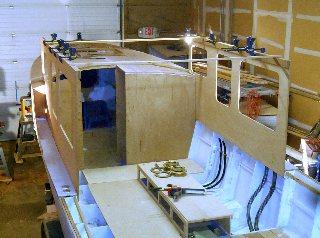 — Faired up the sides and bulwarks for primer. Foredeck is ready for glass.