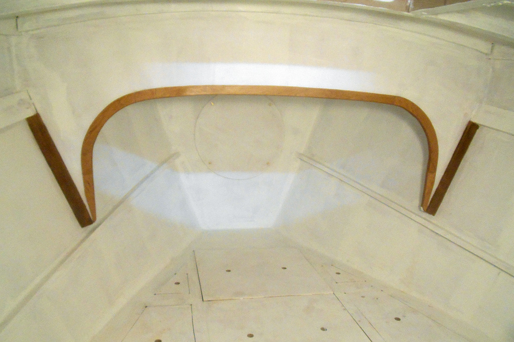 The interior is now as far as I can get it without building myself into a corner when it’s time to start the plumbing.  So I built and installed a couple small drawers for the galley and primed everything in the forecabin.  It looked so bare at that point that I went ahead and trimmed out the beautiful curve that Mark designed to separate the cabin area from the foredeck.  Also, the gaping hole into the anchor locker is now closed with a round panel secured with some beautiful knurled screws and threaded inserts that will make it easy to remove when necessary.