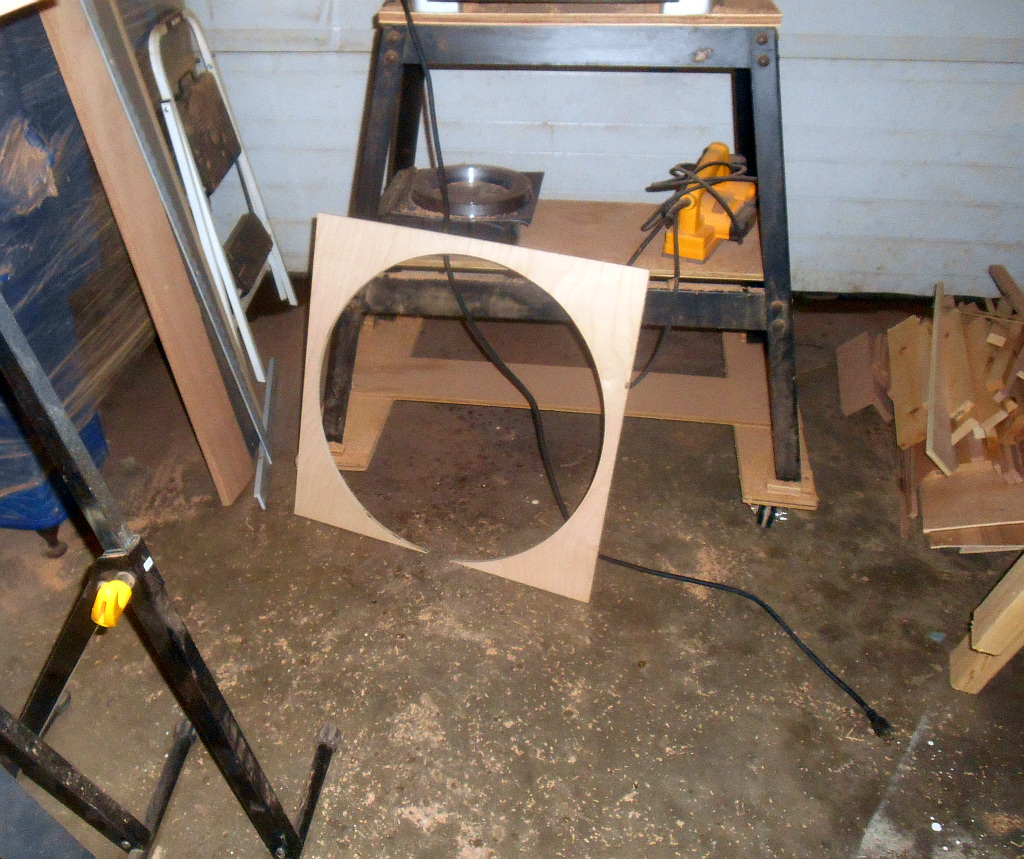Circle maker. Use a dowel to put a pivot at the radius you want and spin the blank around against the blade.