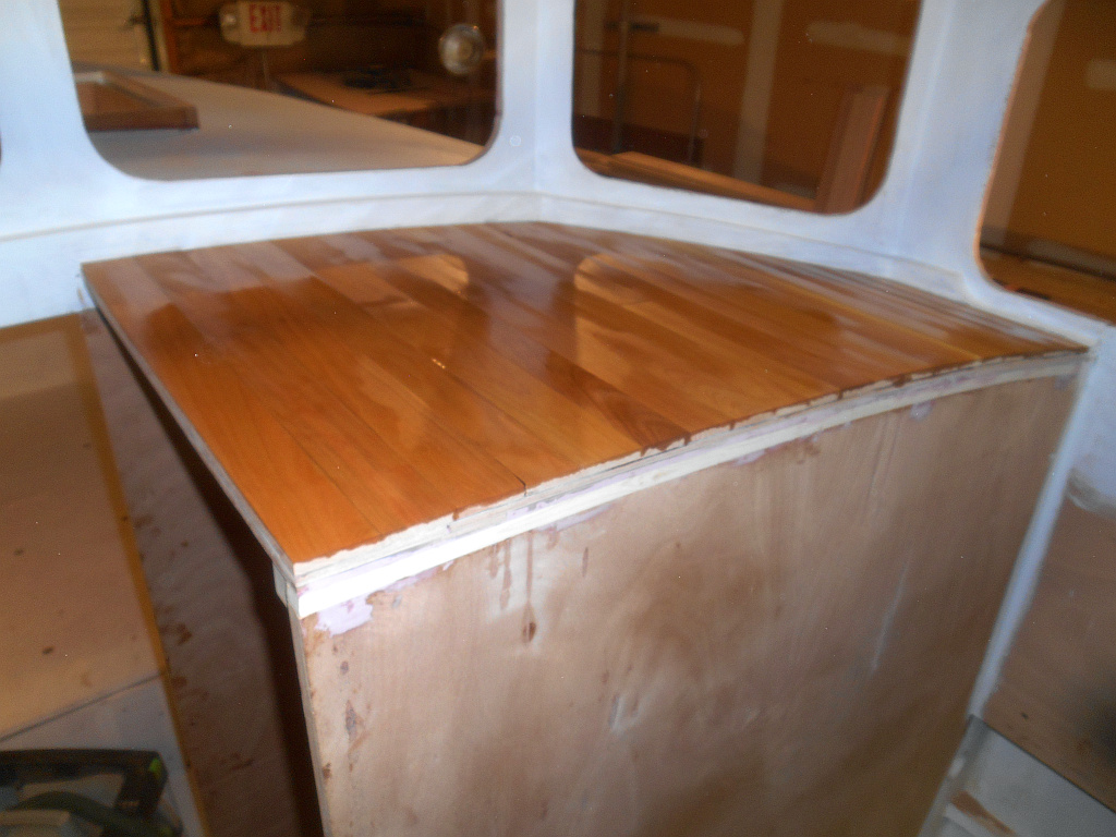 While waiting for paint to dry, I took all the small pieces of cherry left over from beams and drawers and sheathed the “dashboard” over the head and forward of the steering station.