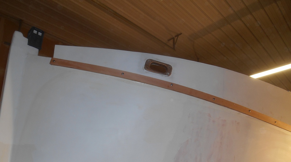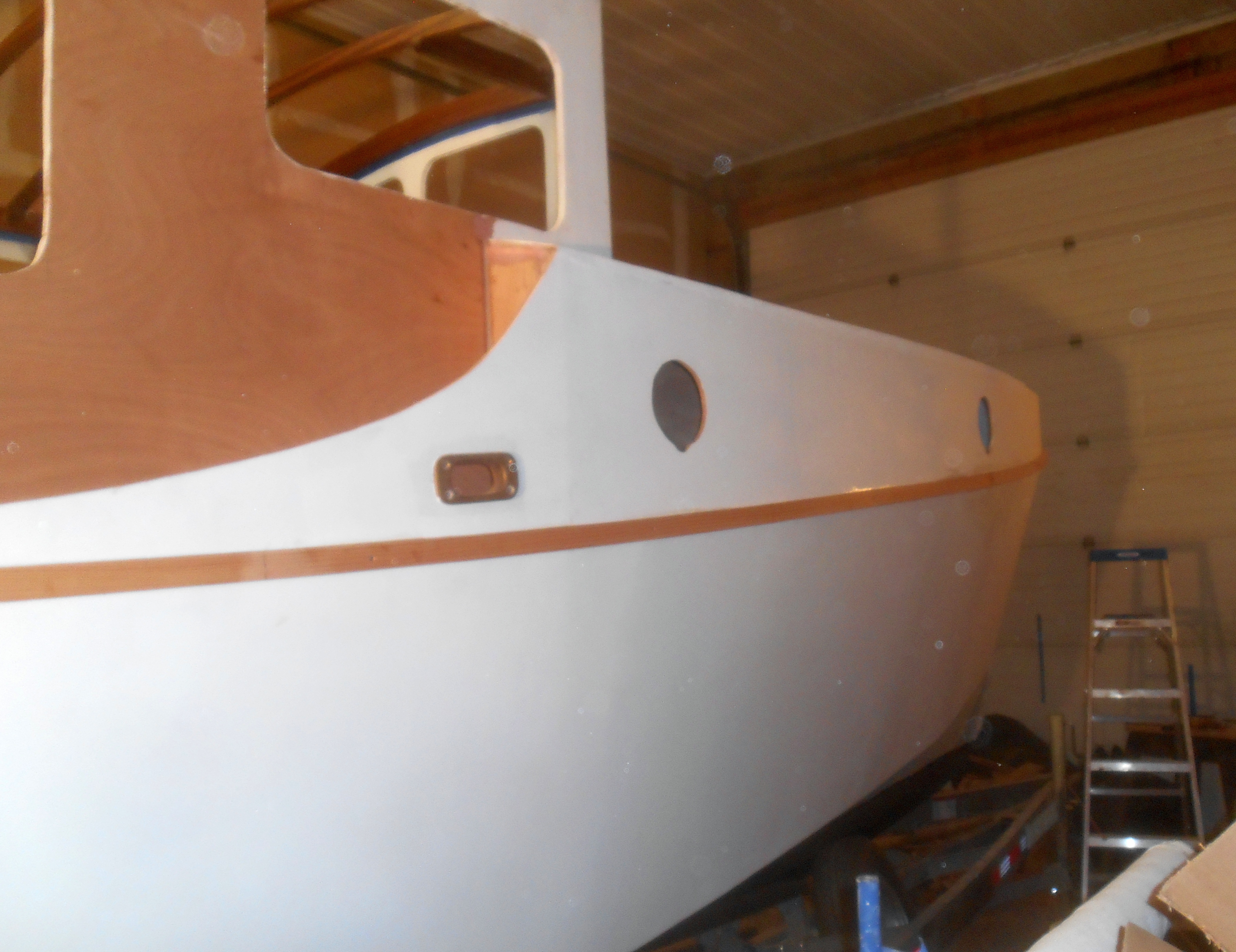 — Scarphed, glued and installed the rubrail base. This was a challenge because I couldn’t use the Lackey Method and manufacture and install it in one sweeping curve. There was just too much bend in the bow, so I had to screw laminations to the sheer strake one at a time over three days. That led to the always-awkward joining of a laminated section to a solid section. The laminations tend to make an uneven scarph, since the radius of each piece around the bow is just a little bit bigger as each layer goes on, and the scarph gets too long. But epoxy cures all and the final result is okay — and will be really okay when covered with the mahogany caprail.