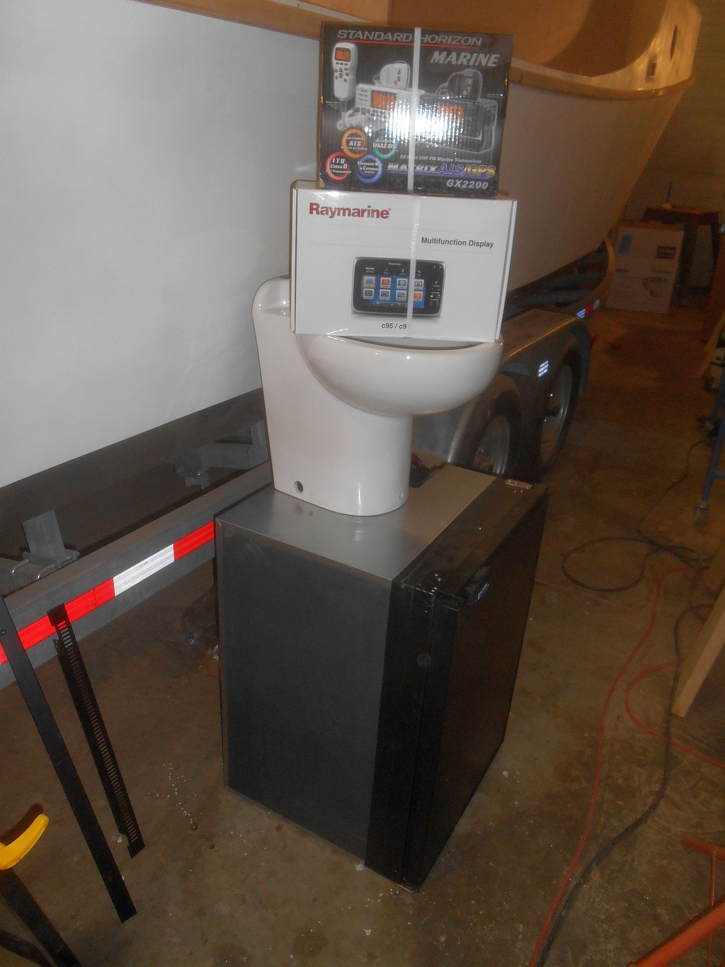 Then it was Christmas in April. A marine distributor called Defender Marine about 45 minutes from here has a “Warehouse Sale” once a year featuring huge discounts on products from major manufacturers, since Defender obviously has the leverage to say “work with us” (i.e. pound them down). “Suggested retail” means nothing these days, but I walked with a refrigerator/freezer, chartplotter, AIS radio, head, main electrical panel, battery switch and automatic charging relay for about two-thirds the price of a major marine retailer whose name rimes with Best, but is certainly not in terms of price.