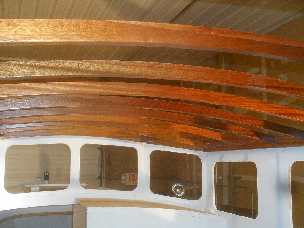 — Got all the varnish on the overhead beams in the deckhouse: two thinned gloss base coats, three gloss finish coats, plus a final coat of satin, sanding between every darn one! The idea is to use the glass varnish to build up depth and the satin coat to give the beams a “rubbed effect.” I’ve seen Tim Lackey use this method time and time again, and it works wonders. The beams look like old English furniture, and the graininess that the gloss was picking up is gone. Even my neighbor Tom Tolla, builder of highly detailed Shoreline mansions, thought they looked pretty good. Interlux Schooner for the gloss, Interlux Goldspar for the satin. I’ve been fooling around with finishes for 25 years now, and these are my favorite two varnishes.