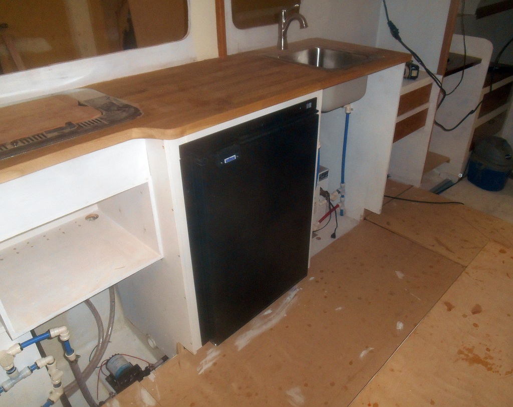 More on that later, but the refrigerator and head are in. The fridge is large for a boat this size, but after 30 years of lugging ice to various boats I have owned, I wanted a good one (Isotherm) and they use so much less electricity that they used to I could go king size. It fit like a glove and no wonder, since the fridge determined the size of the countertops, deckhouse door and passageway, and was the key element in the whole galley design. So it had been measured at least 100 times. Had it not fit, The Tardis Project would have gone to Valhalla soaked in dinghy gas.