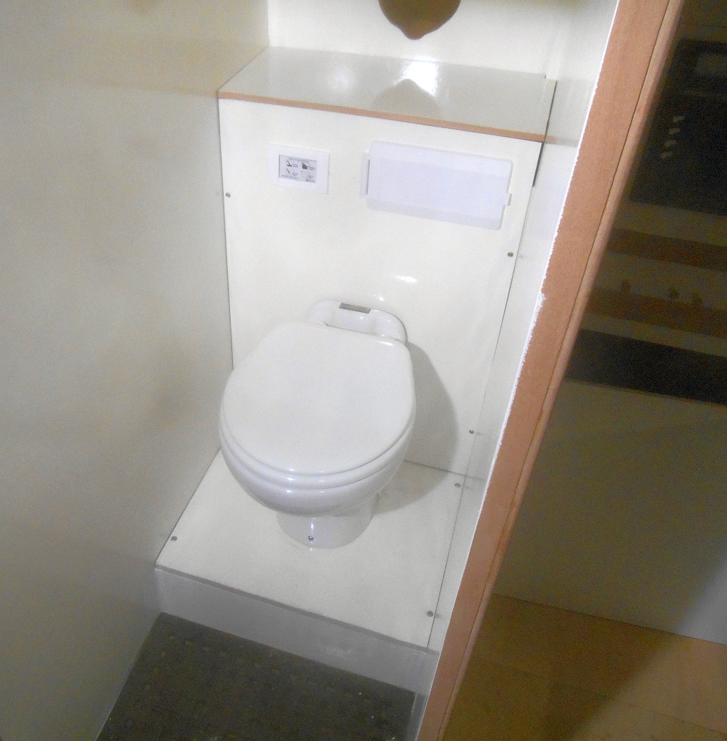 The head is a Raritan Marine Elegance, an electric macerating fresh water model that I first used on our Great Loop trip. It is a great piece of equipment. Used daily by two people for a year on Memsahib it never clogged, used a paltry amount of a water and electricity, and since it flushed with fresh water, never smelled. (Marine heads usually flush with salt water, which combined with sewage, creates a gas output equal to that of a small dairy herd).