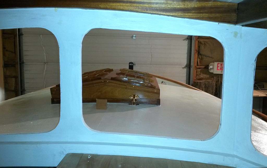 But we sweated it out today, and the hatch is on. It looks just stunning, another tribute to Mark’s artistry. I was afraid it would block vision from the helm, but as you can see from the picture, the actual sightline is just below the level of the forward bulwark. The hatch actually raises pretty easily to “open” position on the very fancy bronze hinges I got from Sailors’ Solutions. Eventually I may get some brass hatch lifters, but for now a notched mahogany stick should work just fine.