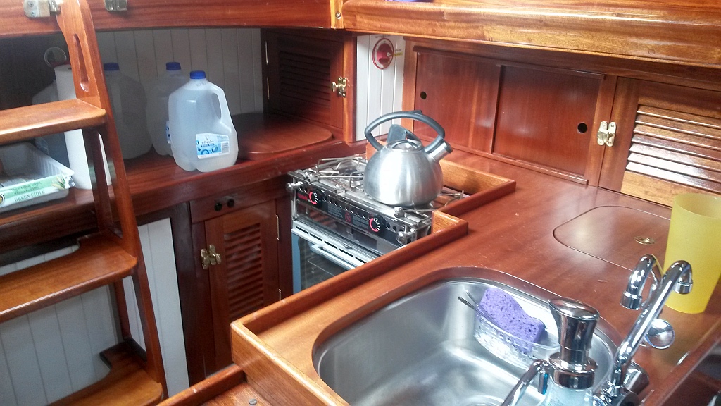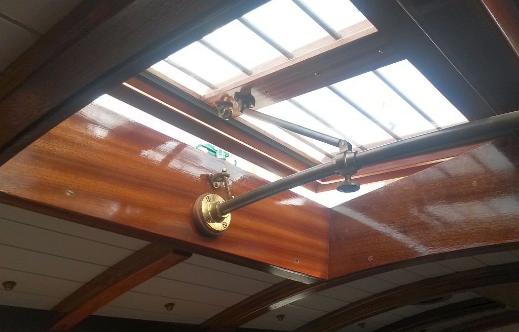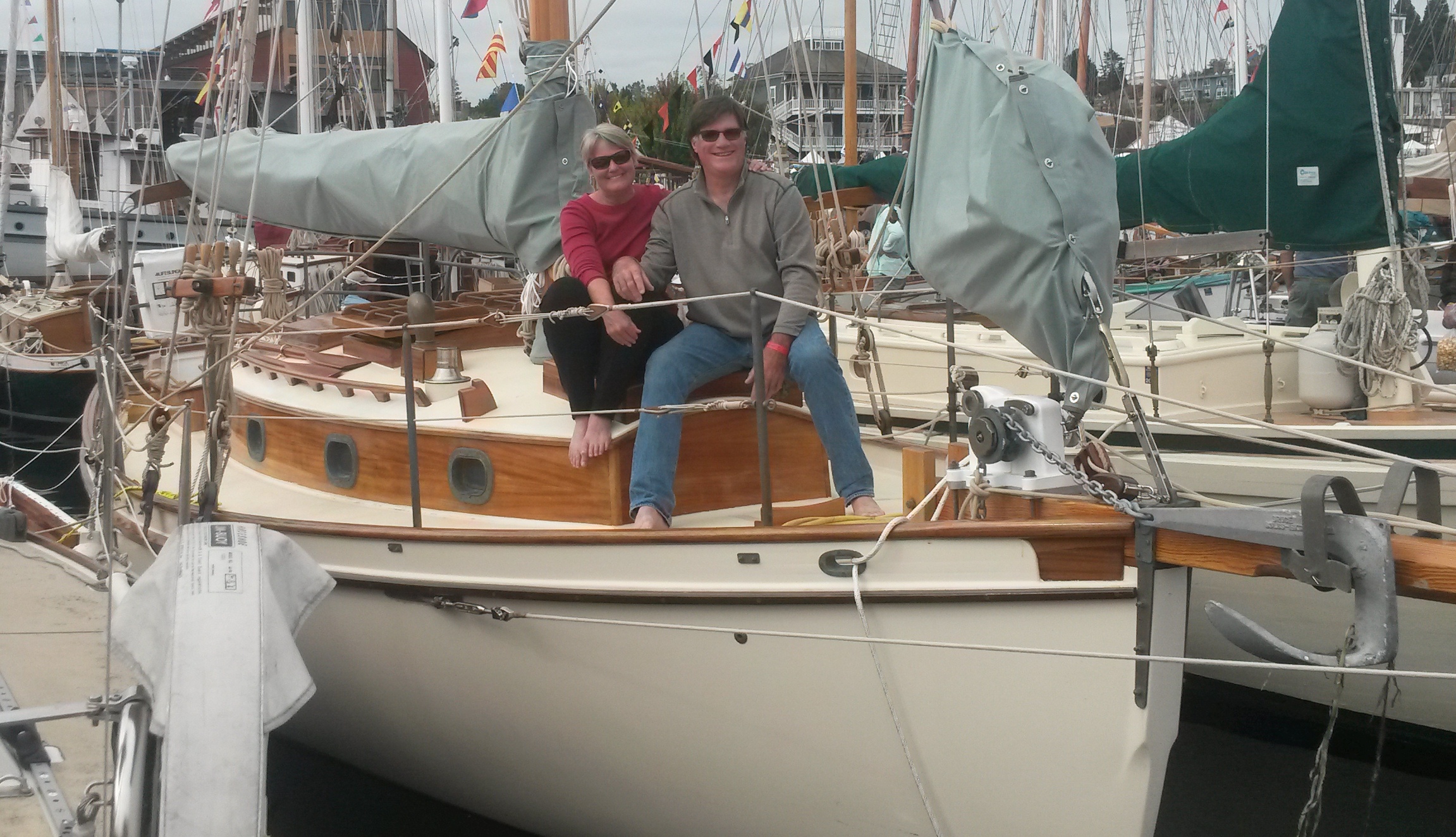 Beckon is perfect — a symphony of mahogany and bronze and brass. Custom everything — louvered doors, hatch openers, hardware, furniture, stanchions. Richard is by trade a cabinetmaker and there is not a joint that can be seen. She gleams in Jane-applied paint and varnish. I had trouble getting good pictures with light streaming through the ports, but there are a lot better ones in the Beck’s build journal, to the right of this post in the links section. The rig is still in shake-down mode, but is also quite interesting in that it is set up very traditionally with dead-eyes and lanyards, laced-on sails and gaff rig, but all of these using the very latest in high-tech cordage. The effect is stunning — a perfect, tough seagoing yacht from 80 years ago that was built yesterday using materials that should last another 100 years or more.