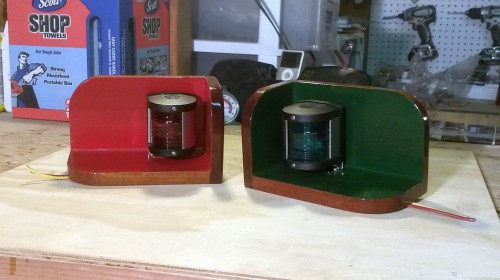 I finished these navigation lights, copied from a beautiful design by Tim Lackey, on August 9, 2014: two years, four months and 5 days ago. They were a motivational tool of sorts — building a set of beautiful lights with no boat to go under them would be pretty stupid, so I put the lights up on a shelf where I could always see them and got going. But with the actual boat almost done, it was time to put them in their rightful spots on the Tardis. It felt good –sort of like planting the flag at base camp prior to the final ascent up the mountain.