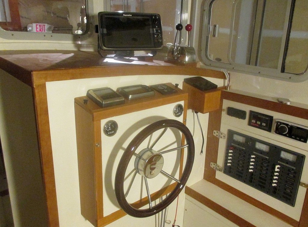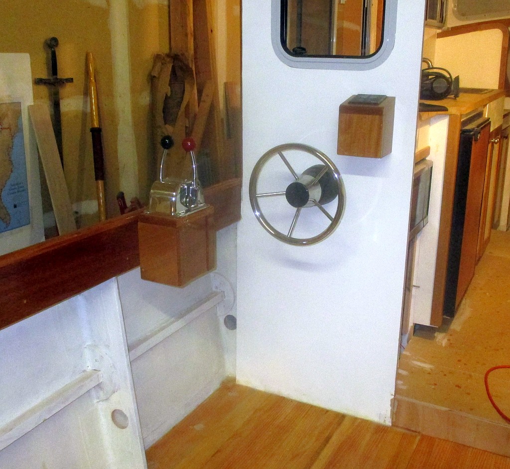 Much of the work now is hidden, so no pictures. I had to glue backing blocks for deck hardware installation up into impossibly small areas way up under the deck. This is just not the kind of thing I would have ever thought of 18 months ago, but should have. I am pretty sore, but maybe not as sore at 66 as I used to be at 56 when crawling around in Memsahib after a day riding a desk. I think that is good. There are loads of wires in back of the helm console, too, hooking together the MFD, depth sounder and steering system. And the bow thruster works from both helms. I leave the main switch on so once in a while I can hit the turn button, hear a big buzz and pretend I am in really fun wind-over-current solo docking situation in a hail storm, which after all is the ultimate goal of this project.