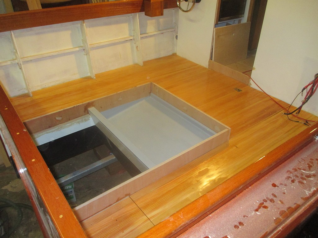 The decks are in and soaked with clear penetrating epoxy sealer. The pictures look very yellow, but the decks will eventually get a sort of maple-syrup color with a couple coats of Cetol Natural teak, which will also make them grippy.