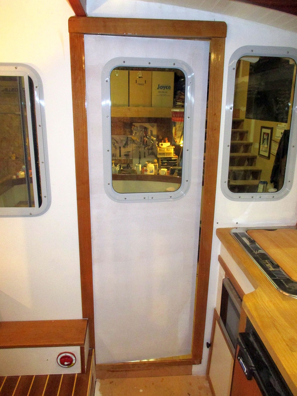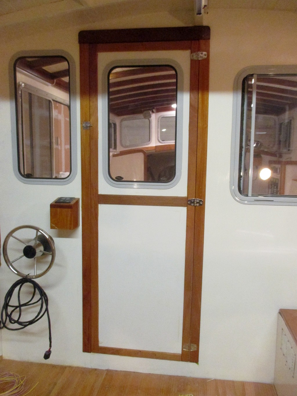 Anyway, Ray and I hung the door and it looks good. The bulkhead near it is a little bit bowed so not a perfect fit, but a barrel bolt needed to keep the door shut anyway has it closing fine.