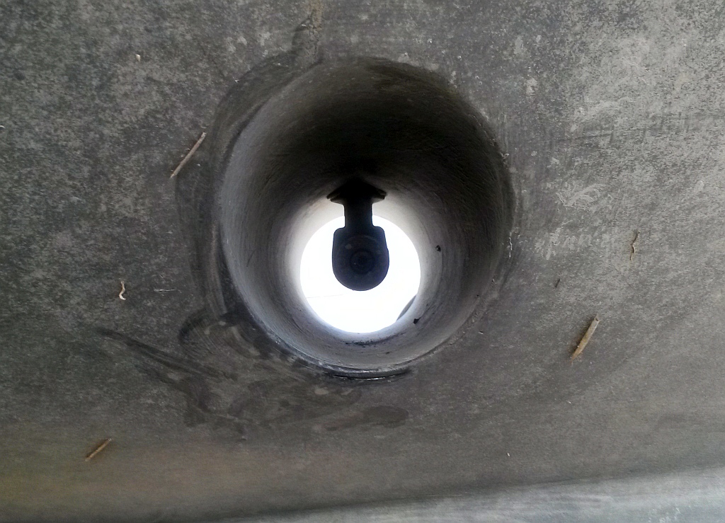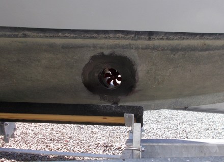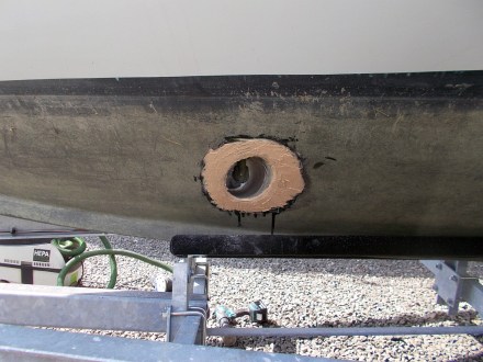 Careful examination of the thruster tube revealed a tiny crevice in the hull near the bottom of the starboard side. I remember being very proud of the tight fit I had achieved installing the tunnel, but I would have been a lot better off with a big gap jammed full of epoxy. All epoxy-based fillers shrink during the exothermic reaction that makes them so tough, and I think the filler simply shrank itself into a little crack.