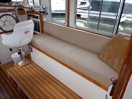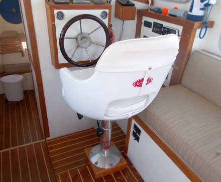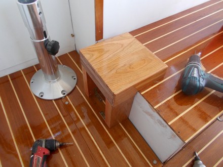 With the cushions in, I could finish the dinette floors and establish the height for a permanent helm seat base. It came out looking nice and very solid. John and I were out for quite a while today doing engine efficiency tests and it was very comfortable, although I still need to fiddle a bit with the height and fore-and-aft adjustments just a bit to maximize visibility.