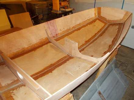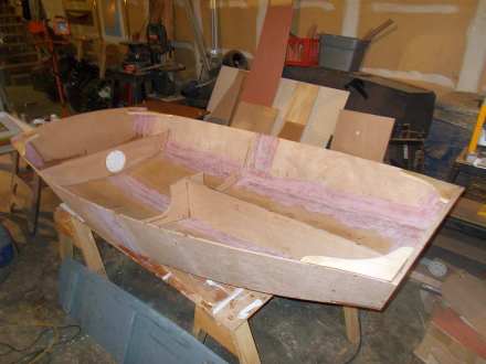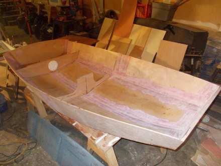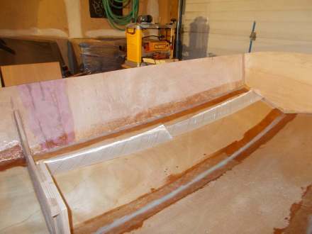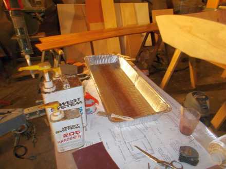 Meanwhile, work on the Offcut continues at a very leisurely pace. After pulling the stitches and turning the boat over, the next job was taping all the seams with 12-0unce “biaxial” tape, super-strong fiberglass that has strength no matter which way it’s twisted or pulled. This is important in a boat that has virtually no mechanical fastenings, but biax is really tough to wet out with epoxy to make it stick. So I got out my old lasagna pans and wet it out by pouring on epoxy, then brushing it in, and it went very well. When placed over a seam that has been painted out with epoxy, virtually no more wetout is required and the best tool for smoothing everything out is simply a hand in a rubber glove. Compared to my first efforts on Tardis, the taping looks pretty good, although fairing out and sanding over and over again is a pain, since all the seams show and even on a workboat, you want them halfway decent.