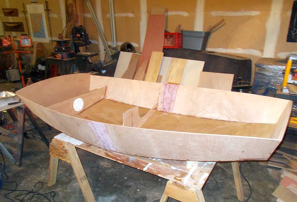 Meanwhile, work on the Offcut continues at a very leisurely pace. After pulling the stitches and turning the boat over, the next job was taping all the seams with 12-0unce “biaxial” tape, super-strong fiberglass that has strength no matter which way it’s twisted or pulled. This is important in a boat that has virtually no mechanical fastenings, but biax is really tough to wet out with epoxy to make it stick. So I got out my old lasagna pans and wet it out by pouring on epoxy, then brushing it in, and it went very well. When placed over a seam that has been painted out with epoxy, virtually no more wetout is required and the best tool for smoothing everything out is simply a hand in a rubber glove. Compared to my first efforts on Tardis, the taping looks pretty good, although fairing out and sanding over and over again is a pain, since all the seams show and even on a workboat, you want them halfway decent.