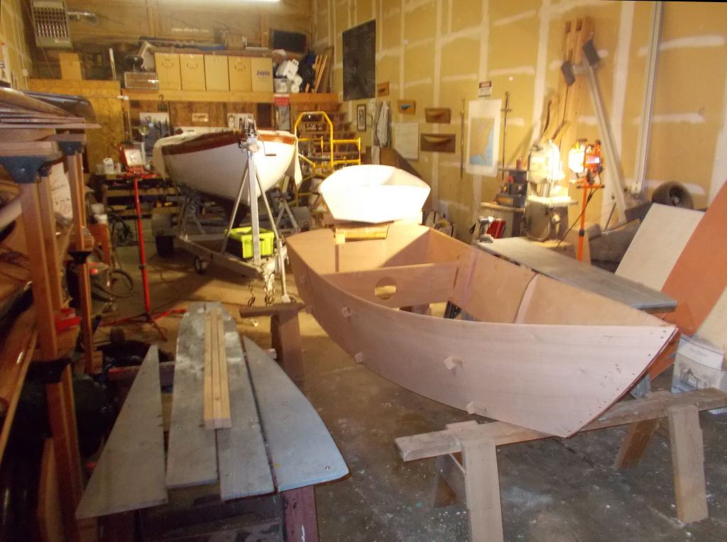 — Ray’s Herreshoff 12 1/2 footer is under the tarp. We have some final bottom work to do, but basically she’s ready to rig and launch as soon as Ray gets back from a little jaunt over to Egypt.