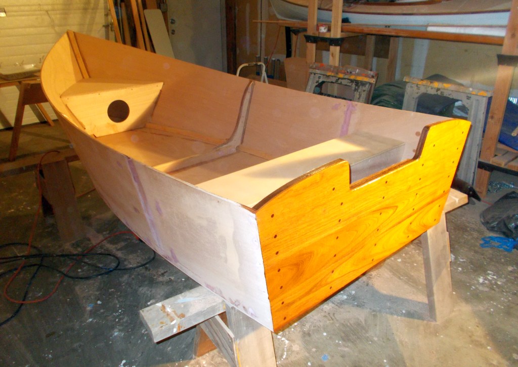 — The small boat in build is also for the Museum. We had a Clint Chase Compass Point Skiff kit left over from last year’s boatbuilding workshop, so I’m finishing it to use as a silent auction or raffle prize. So she is getting the full treatment — mahogany veneer on the transom, solid wood breasthook , quarter knees and seats, no exposed plywood edges, two-part epoxy finish, and as many coats of varnish as I can get on by May 31.