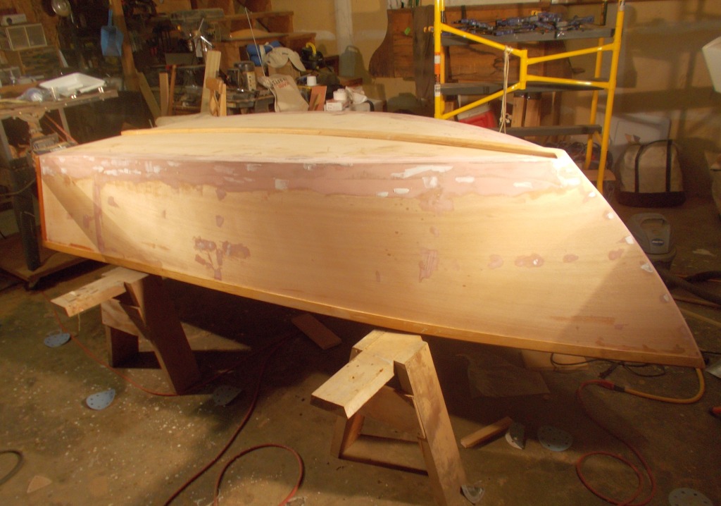 I know we have some hard core builders reading this blog now thanks to Jamestown Distributors, so I want to mention I new product that saved my bacon on the timing — Pettit EZ Fair in a tube. Fiberglass over plywood boats are basically an exercise in sanding, filling and fairing, and a 24-hour dry time between fairings is sometimes just a killer. So I found this stuff at West, and you can sand it in about five hours. It’s also a very fine filler, sort of like toothpaste, so you can shoot it into a little blemish and sand usually with just one coat. I shot a thin coat onto all the fillet and smoothed them out with a gloved finger, and they look like gelcoat. I’m sure Jamestown will come up with a version soon.