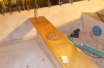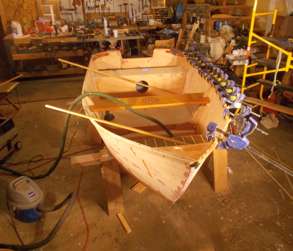 Only about a month ago, we decided that the Compass Skiff I described building in the last post would be a featured item at “Riverfare,” the season opening fundraiser and silent auction for the Connecticut River Museum. But that meant I had to take the boat to a very high level of finish. So on went 10 coats of varnish, a teak-and-holly “deck,” an inlaid compass rose on the central thwart, all solid mahogany trim and transom, bronze and brass hardware, bronze rubbing strips on all the corners, a fancy rubrail dadoed in so no exposed plywood edges would show anywhere, non-skid paint on the floor. Every joint had to be tight — no filler allowed!