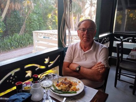 John and I visited Cabbage Key, a small resort and big (excellent) restaurant accessible only by boat, in 2013. During the day a lot of lunch cruisers and tour boats make the trip over and it can get crowded, but at night the tiny marina only has a few boats. So everybody goes up to the restaurant and it becomes sort of family-style, with everyone at their own table, but swapping stories right and left.
