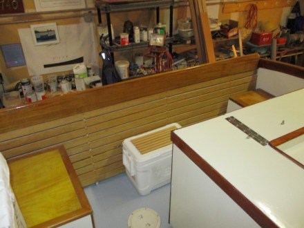 I have long wanted to put a ceiling (which non-boatbuilders would call a finish wall) on the cockpit sides to hide, electric wires, hoses and bad glasswork.  I found some totally clear cherry at a good price, so I ripped it into strips, finished them with a satin varnish, and installed them with bronze screws in case we have to get at a wire.  Really looks nice.