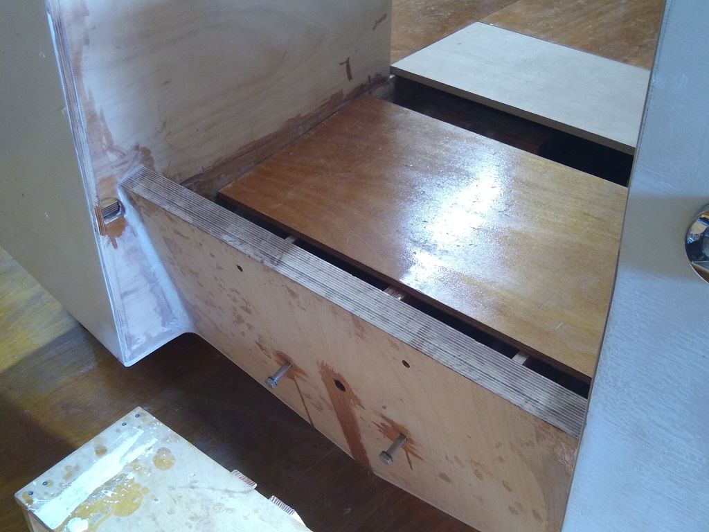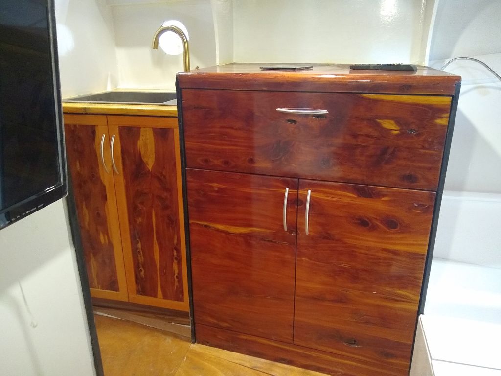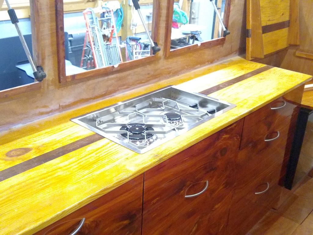 — Having two sinks while living aboard for a long period is nice, but Sytse has gone with one very large sink across from the head, freeing up a lot of galley counter space. If I were building Tardis now, I would go with a single galley sink and use the area where the head sink is for more drawers and space for a heater.