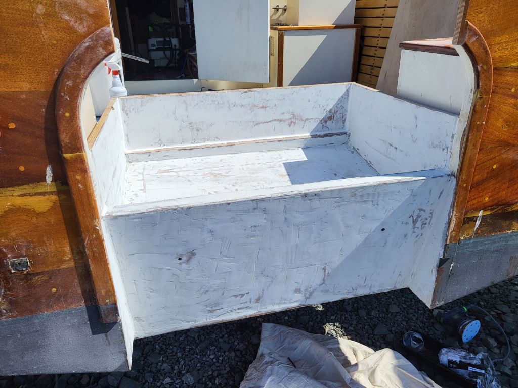Wrong as always. Because of the Memorial Day weekend, my intrepid hauler Kevin needs to take Tardis to Maine May 20. And I will be in Washington State for a week for my sister’s 50th anniversary. So cool weather, rain and what seems like a huge amount of glassing, painting and fairing for such a small project are stretching the timeline on and on. Plus, I will admit I just can’t spend the time I used to 10 years ago laying on a bed of rocks sanding and fiberglassing with my arms stretched overhead and back killing me.